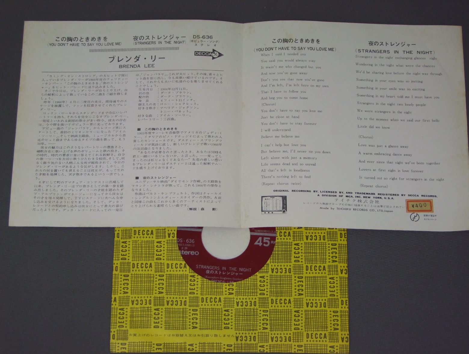 BRENDA LEEブレンダ・リー/YOU DON`T HAVE TO SAY YOU LOVE MEこの胸のときめきを DS636 製造国:日本盤 / Media:7inch外観:EX-盤の状態:EX+ 価格(税込):¥440(売約済) 送料 7inch:定形外郵便 360円~LP:定形外郵便 660円~送料は、注文の最終画面で確認頂けます。 > > BRENDA LEE/YOU DON`T HAVE TO SAY YOU LOVE ME 外観 (EX-)特記事項:背スレやヨレ軽く有り。裏側や見開きに薄いシミ。右上に折れ跡有り。外観EX-の共通説明:ダメージ軽度~多少。 中古品としては普通の状態。シミ、ヨゴレ、スレなど軽く~多少。 盤の状態 (EX+)特記事項:薄いスリキズ・スレ少し。一見してきれいな状態です。盤EX+の共通説明:盤面の極薄いスリキズ、スレ少し程度 音に出そうなものは無いように見える(極軽微なソフトティック音は除く)。 Tweet それぞれの画像をクリックすると、大きい写真が見られます こちらの商品もお勧めです 1,210円 STUFFスタッフ / LIVE STUFFライヴ・スタッフ 1,210円 CLARKE BOLAND BIG BAND / SAME TITEL 770円 24th STREET BAND24th ストリート・バンド / FEATURING HIRAM BULLOCKフィーチャリング ハイラム・ブロック 1,320円 EDDIE COSTA TRIOエディ・コスタ・トリオ / HOUSE OF BLUE LIGHTSハウス・オブ・ブルー・ライツ 990円 HERBIE MANNハービー・マン / HERBIE MANN VOL12ハービー・マン VOL12 990円 CHARLIE PARKERチャーリー・パーカー / CHARLIE PARKER ON SAVOY VOL4チャーリー・パーカー・オン・サヴォイVOL4 1,210円 BENNY GOODMAN TRIOベニーグッドマントリオ / PLAYS FOR FLETCHER HENDERSON FUNDプレイズ・フォー・ザ・フィレッチャー・ヘンダーソン 1,650円 TATSUYA TAKAHASHI&TOKYO UNION ORCH.高橋達也と東京ユニオン / SWING ON SWINGスイング・オン・スイング