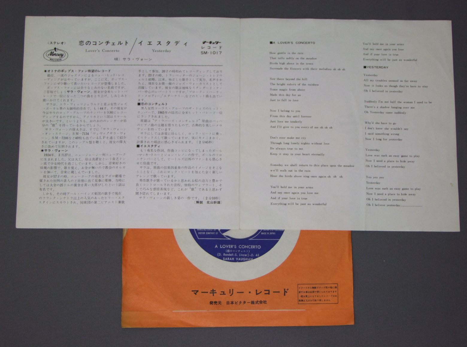 SARAH VAUGHANサラ・ヴォーン/LOVER`S CONCERTO恋のコンチェルト SM1017 製造国:日本盤 / Media:7inch外観:EX-盤の状態:EX- 価格(税込):¥990(売約済) 送料 7inch:定形外郵便 360円~LP:定形外郵便 660円~送料は、注文の最終画面で確認頂けます。 > > SARAH VAUGHAN/LOVER`S CONCERTO 外観 (EX-)特記事項:背スレ有り。ヨレや折れ跡有り。表ジャケの右上に切れ目小。見開き側に薄い日焼け感やよごれ有り。外観EX-の共通説明:ダメージ軽度~多少。 中古品としては普通の状態。シミ、ヨゴレ、スレなど軽く~多少。 盤の状態 (EX-)特記事項:薄いスリキズ・細かい表面スレ軽くある感じ。プチ出そうな所は少し、全体的には殆どが軽微なものの様子です。盤EX-の共通説明:盤面のスリキズが多少有り。音に出そうなものは殆ど無いように見える~さほど気にならないぐらいの軽いプチ数カ所程度。 その他:※画像では確認できない、上下ヘリ、背表紙、取り出し口を中心に状態表記しております。画像で確認出来る表裏ジャケ、レーベルの状態表記は省いている場合がありますので、そちらの状態は画像でご確認をお願い致します。携帯の方は一度PC等で写真をご確認の上ご入札下さいますよう、お願い申し上げます。 Tweet それぞれの画像をクリックすると、大きい写真が見られます こちらの商品もお勧めです 660円 CAL TJADERカル・ジェイダー / SHINING SEAシャイニング・シー 1,320円 JOHN COLTRANE & WILBURN HARDENジョン・コルトレーン&ウィルバー・ハーディン / MAINSTREAM 1958メインストリーム1958 440円 JONES BOYS / WHOLE TOWN`S TALKING ABOUT 770円 ANDREAS VOLLENWEIDERアンドレアス・フォーレンヴァイダー / WHITE WINDSホワイト・ウィンズ 1,320円 TOSHIKO AKIYOSHI - LEW TABACKIN BIG BAND秋吉敏子=ルー・タバキン・ビッグ・バンド / INSIGHTSインサイツ 1,210円 HERBIE MANNハービー・マン / GLORY OF LOVEグローリー・オブ・ラヴ 770円 TERUMASA HINO日野皓正 / DOUBLE RAINBOWダブル・レインボー 1,210円 MODERN JAZZ QUARTETMJQ / ART OF THE MODERN JAZZ QUARTETアート・オブ・MJQ
