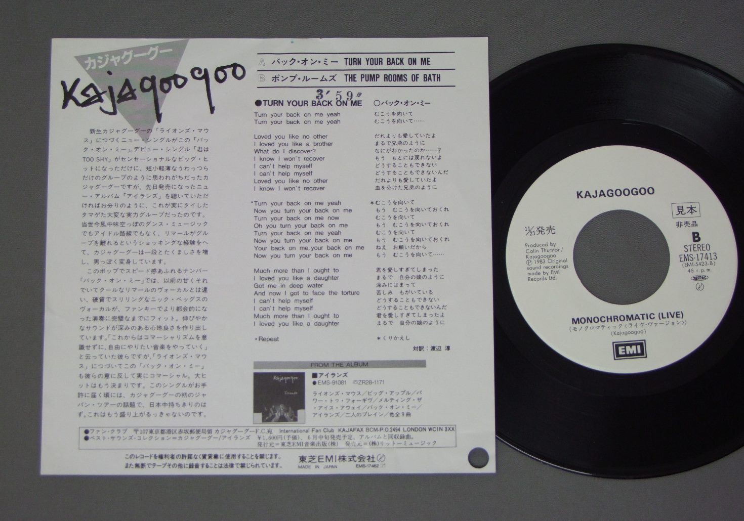 KAJA GOO GOOカジャグーグー/TURN YOUR BACK ON ME WLPバック・オン・ミー EMS17413 製造国:日本盤 / Media:7inch外観:VG+盤の状態:EX 価格(税込):¥330 送料 7inch:定形外郵便 360円~LP:定形外郵便 660円~送料は、注文の最終画面で確認頂けます。 > > KAJA GOO GOO/TURN YOUR BACK ON ME WLP 外観 (VG+)特記事項:ヨレ有り。外観VG+の共通説明:ダメージやや有り。シミ、ヨゴレ、スレなど多少~やや多め。 盤の状態 (EX)特記事項:薄いスリキズ・スレ軽くある感じ。一見してきれいな印象です。盤EXの共通説明:盤面のスリキズが薄いものが少し~軽度 音に出そうなものは無いように見える(軽微なソフトティック音は除く)。 その他:白見本盤 Tweet それぞれの画像をクリックすると、大きい写真が見られます こちらの商品もお勧めです 770円 CHEAP TRICKチープ・トリック / HEAVEN TONIGHT天国の罠 1,320円 TAZMANIAN DEVILSタズマニアン・デヴィルズ / TAZMANIAN DEVILSアメリカン・ドリームを探して 1,210円 OXOオクソ / 1st ALBUMオクソ 770円 NENAネーナ / ? (FRAGEZEICHEN)? (クエスチョンマーク) 440円 TEN TENテン・テン / WALK ONウォーク・オン 1,320円 NENAネーナ / NENAロックバルーンは99 1,320円 CLASSIX NOUVEAUXクラシックス・ヌヴォー / NIGHT PEOPLE夜行人間 770円 CHEAP TRICKチープ・トリック / HEAVEN TONIGHT天国の罠(トリック)