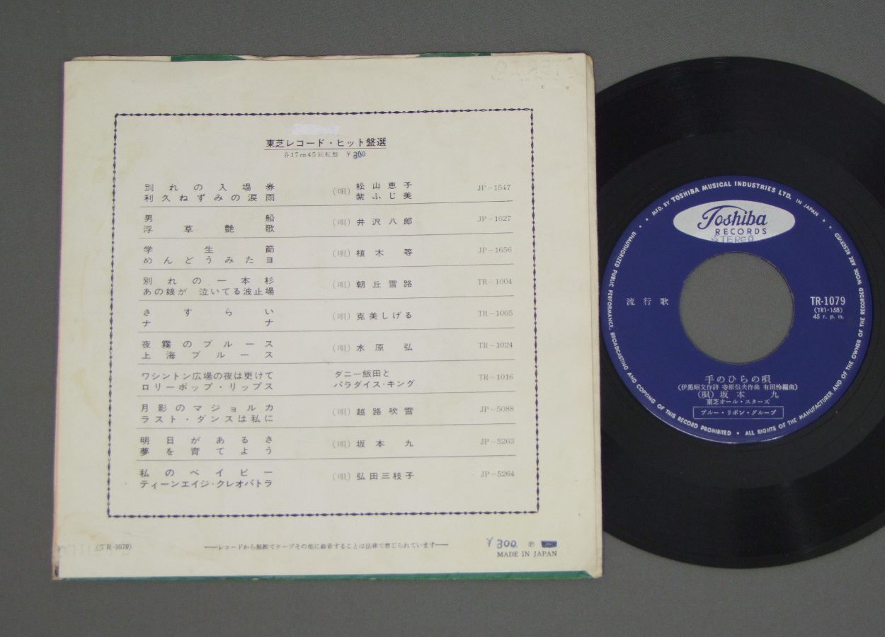 坂本九/幸せなら手をたたこう TR1079 製造国:日本盤 / Media:7inch外観:VG盤の状態:EX- 価格(税込):¥524(売約済) 送料 7inch:定形外郵便 360円~LP:定形外郵便 660円~送料は、注文の最終画面で確認頂けます。 > > / 外観 (VG)特記事項:表ジャケは日焼け退色感結構あり。表裏見開きにホワイトでの着色有り。裏ジャケに右上角にホッチキス穴。外観VGの共通説明:ダメージが見るからに多い。 盤の状態 (EX-)特記事項:薄いスリキズ・細かい表面スレ多少ある感じ。殆どが軽微なものの様子です。盤EX-の共通説明:盤面のスリキズが多少有り。音に出そうなものは殆ど無いように見える~さほど気にならないぐらいの軽いプチ数カ所程度。 Tweet それぞれの画像をクリックすると、大きい写真が見られます こちらの商品もお勧めです 1,210円 KEIICHIRO AKAGI赤木圭一郎 / EIEN-NO-TONY永遠のトニー 赤木圭一郎絶唱集 770円 HIBARI MISORA美空ひばり / 1932-35芸能生活30周年記念 歌謡曲50年 第2集 ( 昭和7- 10年) 1,210円 高峰秀子-橋幸夫 他 / 続 日本流行歌史 770円 MIEKO TAKAMINE高峰三枝子 / SONG ALBUM高峰三枝子 歌のアルバム 880円 YUKIO HASHI橋幸夫 / FROM ITAKOGASA TO MUHYO黄金の声/潮来笠から霧氷まで 1,320円 藤山一郎 - 美空ひばり - 高峰三枝子 - 織井茂子 他 / ベスト20 特選-映画主題歌集 (2) 880円 村田英雄-青山和子-安達明 他 / コロムビア歌のハイライト (第五集) 660円 AKIRA MATSUDAIRA松平晃 / CIRCUS SONG懐かしの針音 松平晃 サーカスの唄