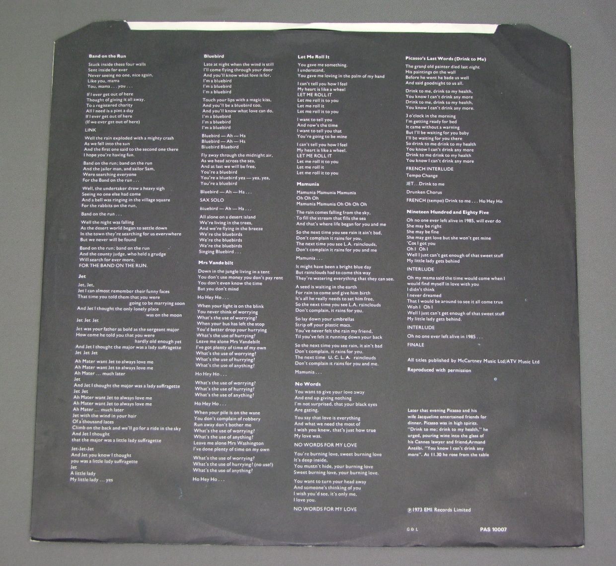 WINGS/BAND ON THE RUNマト2通常盤 PAS10007 製造国:英国盤 / Media:LPMatrix: -2/1/ROP | -2/8/RAM外観:EX-盤の状態:EX+ 価格(税込):¥5,500(売約済) 送料 7inch:定形外郵便 360円~LP:定形外郵便 660円~送料は、注文の最終画面で確認頂けます。 > > WINGS/BAND ON THE RUN 外観 (EX-)特記事項:背上下にしぼりの有るタイプ。底スレやや有り。背スレ多少。ジャケ表面は薄いスレやや有り。スリキズやよごれ等は薄い感じ。オリジナルインナーは上角のカットされた初期タイプ。抜けは無く、ヨレやよごれ等も少ない感じです。ポスターのめくりヨレは少ない感じ。外観EX-の共通説明:ダメージ軽度~多少。 中古品としては普通の状態。シミ、ヨゴレ、スレなど軽く~多少。 盤の状態 (EX+)特記事項:極薄いスリキズ・スレ少しある程度。音に出そうなものもなく一見してきれいな状態です。曲間など、静かなところを中心に聴いて見ましたが、チリノイズ少ないきれいな再生具合でした。盤EX+の共通説明:盤面の極薄いスリキズ、スレ少し程度 音に出そうなものは無いように見える(極軽微なソフトティック音は除く)。 Tweet それぞれの画像をクリックすると、大きい写真が見られます こちらの商品もお勧めです 5,500円 JOHN LENNON / SHAVED FISH 5,500円 GEORGE HARRISON / LIVING IN THE MATERIAL WORLD 4,950円 JOHN & YOKO - PLASTIC ONO BANDF / SOME TIME IN NEW YORK CITY 5,500円 BEATLES / AT THE HOLLYWOOD BOWL 5,500円 GEORGE HARRISON / THIRTY THREE & 1/3