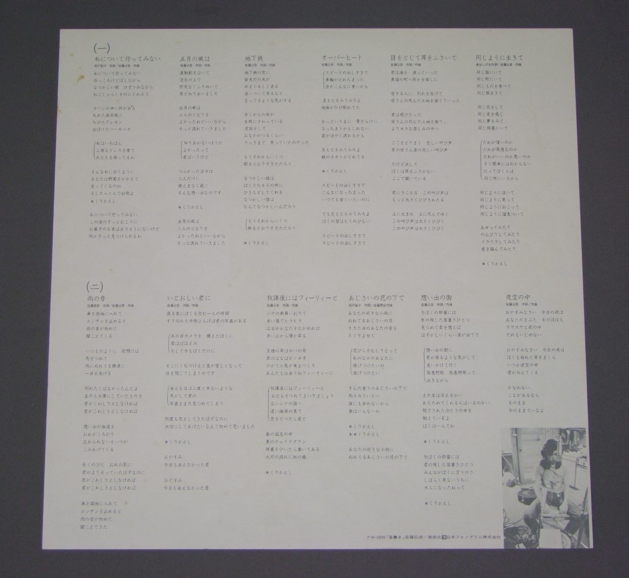 佐藤公彦/ 落書き FW5005 製造国:日本盤 / Media:LP外観:EX盤の状態:EX+帯:EX 価格(税込):¥1,540(売約済) 送料 7inch:定形外郵便 360円~LP:定形外郵便 660円~送料は、注文の最終画面で確認頂けます。 > > / 外観 (EX)特記事項:特記無し。コンディションリストを参照下さい。外観EXの共通説明:ダメージが限定的。中古品としては保存状態がよい方。シミ、ヨゴレ、スレ 少し~軽度。 盤の状態 (EX+)特記事項:薄いスリキズ・スレ少し。一見してきれいな状態です。盤EX+の共通説明:盤面の極薄いスリキズ、スレ少し程度 音に出そうなものは無いように見える(極軽微なソフトティック音は除く)。 帯の状態 (EX):特記無し。コンディションリストを参照下さい。 Tweet それぞれの画像をクリックすると、大きい写真が見られます こちらの商品もお勧めです 1,320円 NEKO猫 / NEKO猫 2,200円 YUTAKA SADOYAMA佐渡山豊 / MOTTO CHIKAKUHEもっと近くへ 1,650円 ITSUTSUNO AKAI FUSEN五つの赤い風船 / 2nd ALBUMフォーク・アルバム第2集 770円 JIRO SUGITA杉田二郎 / 前夜 1,980円 YUZO TOYAOTA豊田勇造 / LIVE拾得ライブ・走れアルマジロ 1,210円 KIMIHIKO SATO佐藤公彦 / KEME VOL.11st ALBUM 午後のふれあい 770円 OSAMU KITAYAMA北山修 / OSAMU KITAYAMA ALBUM戦争を知らない子供たち 北山修作詩集 770円 SHIGERU IZUMIYA泉谷しげる / GOLD RUSH黄金狂時代