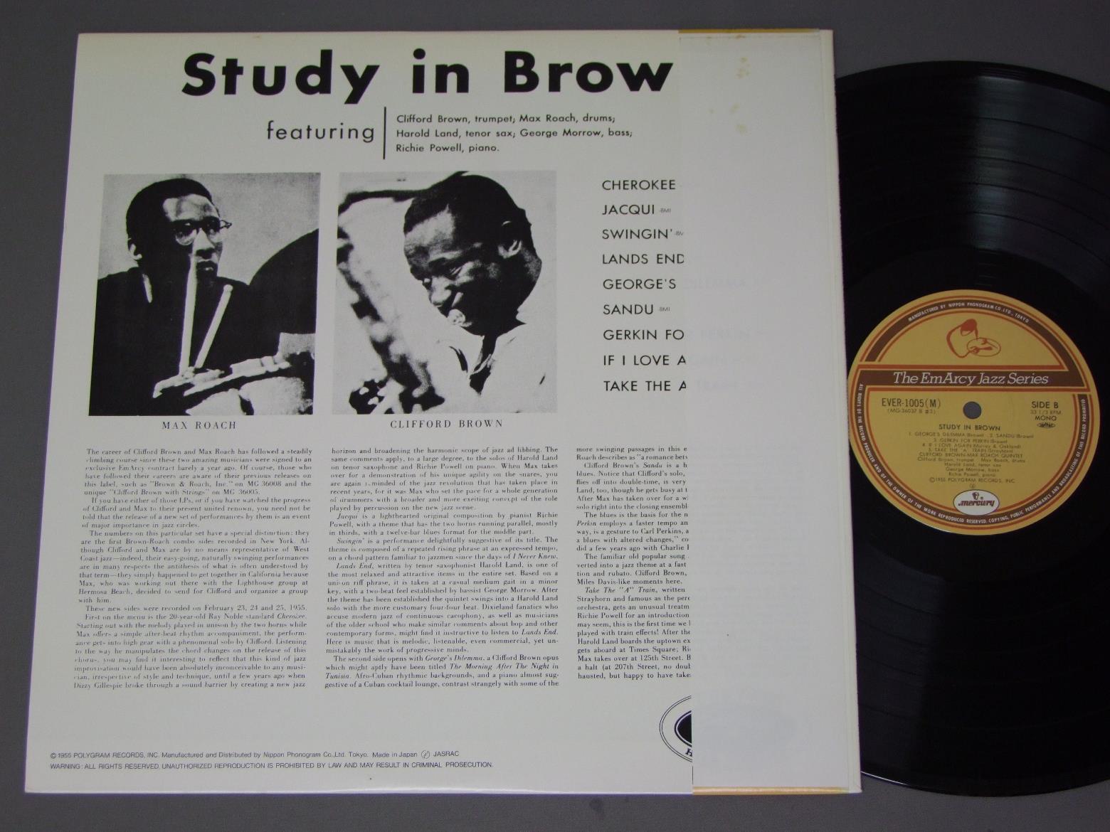 CLIFFORD BROWN-MAX ROACHクリフォード・ブラウン=マックス・ローチ・クインテット/STUDY IN BROWNスタディ・イン・ブラウン EVER1005(M) 製造国:日本盤 / Media:LP外観:EX盤の状態:EX+帯:EX 価格(税込):¥1,047(売約済) 送料 7inch:定形外郵便 360円~LP:定形外郵便 660円~送料は、注文の最終画面で確認頂けます。 > > CLIFFORD BROWN-MAX ROACH/STUDY IN BROWN 外観 (EX)特記事項:上ヘリ付近に日焼け軽。解説カード無し。外観EXの共通説明:ダメージが限定的。中古品としては保存状態がよい方。シミ、ヨゴレ、スレ 少し~軽度。 盤の状態 (EX+)特記事項:極薄いスリキズ・スレ少しだけ。一見してきれいな状態です。盤EX+の共通説明:盤面の極薄いスリキズ、スレ少し程度 音に出そうなものは無いように見える(極軽微なソフトティック音は除く)。 帯の状態 (EX):背側に日焼け。裏側にシミが少々。 Tweet それぞれの画像をクリックすると、大きい写真が見られます こちらの商品もお勧めです 1,320円 MODERN JAZZ QUARTETMJQ / BASED ON BACH & THE BLUESバッハとブルースを基に 440円 SADAO WATANABE渡辺貞夫 / MORNING ISLANDモーニング・アイランド 1,540円 TEDDY WILSONテデイ・ウイルソン / THE TEDDY WILSONザ・テデイ・ウイルソン 1,210円 ERIC DOLPHYエリック・ドルフィー / AT THE FIVE SPOTアット・ザ・5・スポットVOL2 770円 STANLEY CLARKE / JOURNEY TO LOVE 770円 CHICK COREA etcチック・コリア 他 / ECM SPECIALECMスペシャル 1,210円 STUFFスタッフ / LIVE STUFFライヴ・スタッフ 770円 JACQUES LOUSSIER TRIO - ROYAL PHIL. ORCH.ジャック・ルーシェ・トリオ - ロイヤル・フィルハーモニー管弦楽団 / BACH - BRANDENBURG NO5バッハ - ブランデンブルグ協奏曲第5番