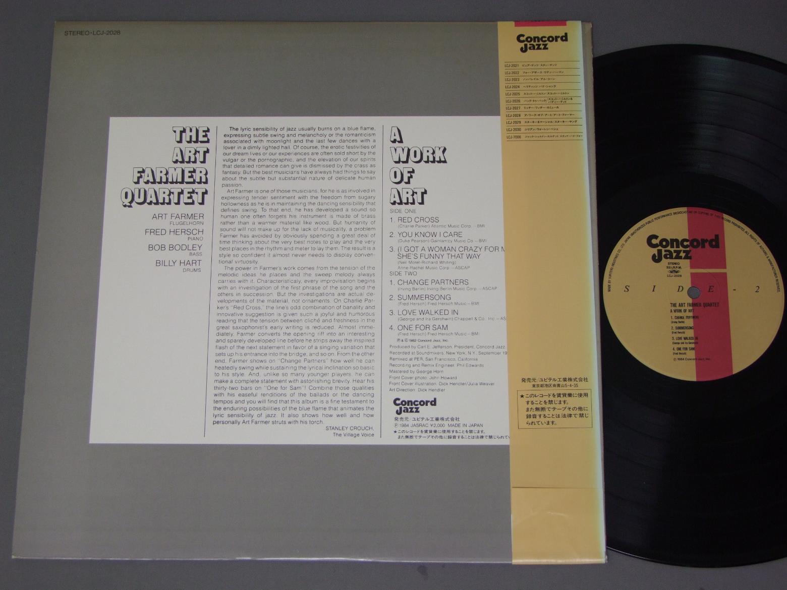 ART FARMER QUARTETアート・ファーマー四重奏団/WORK OF ARTワーク・オブ・アート LCJ2028 製造国:日本盤 / Media:LP外観:EX盤の状態:EX+帯:EX 価格(税込):¥1,100(売約済) 送料 7inch:定形外郵便 360円~LP:定形外郵便 660円~送料は、注文の最終画面で確認頂けます。 > > ART FARMER QUARTET/WORK OF ART 外観 (EX)特記事項:上ヘリ付近に日焼け。外観EXの共通説明:ダメージが限定的。中古品としては保存状態がよい方。シミ、ヨゴレ、スレ 少し~軽度。 盤の状態 (EX+)特記事項:極薄いスリキズ・スレ少しだけ。一見してきれいな状態です。盤EX+の共通説明:盤面の極薄いスリキズ、スレ少し程度 音に出そうなものは無いように見える(極軽微なソフトティック音は除く)。 帯の状態 (EX):背側に日焼け退色 Tweet それぞれの画像をクリックすると、大きい写真が見られます こちらの商品もお勧めです 770円 ART TATUM&HIS BANDアート・テイタム楽団 / ART TATUM & HIS SWINGSTERSアート・テイタム・オール・スター・セッション 1,320円 CHARIE BYRD - HERB ELLIS - BARNY KESSELチャーリー・バード - ハーブ・エリス - バーニー・ケッセル / GREAT GUITEARS 2グレート・ギター 2 1,320円 JACKIE McLEAN QUINTETジャッキー・マクリーン・クインテット / JACKIE McLEAN QUINTETJACIE McLEAN QUINTET 1,650円 THE HERB GELLER SEXTETTEザ・ハーブ・ゲラー・セクステット / SAME TITLE 880円 WILTON FELDERウイルトン・フェルダー / WE ALL HAVE A STAR星の伝説 1,320円 THE QUINTETパーカー - ガレスピー - パウエル - ローチ - ミンガス / JAZZ AT MASSEY HALLジャズ・アット・マッセイ・ホール 1,210円 ART FARMER AND THE ORCHESTRAアート・ファーマー楽団 / LISTEN TO ART FARMER AND THE ORCHESTRA 60s ISSUEアート・ファーマーの芸術 ペラジャケ 660円 QUINCY JONES & BANDクインシー・ジョーンズ / I DIG DANCERSアイ・ディグ・ダンサーズ