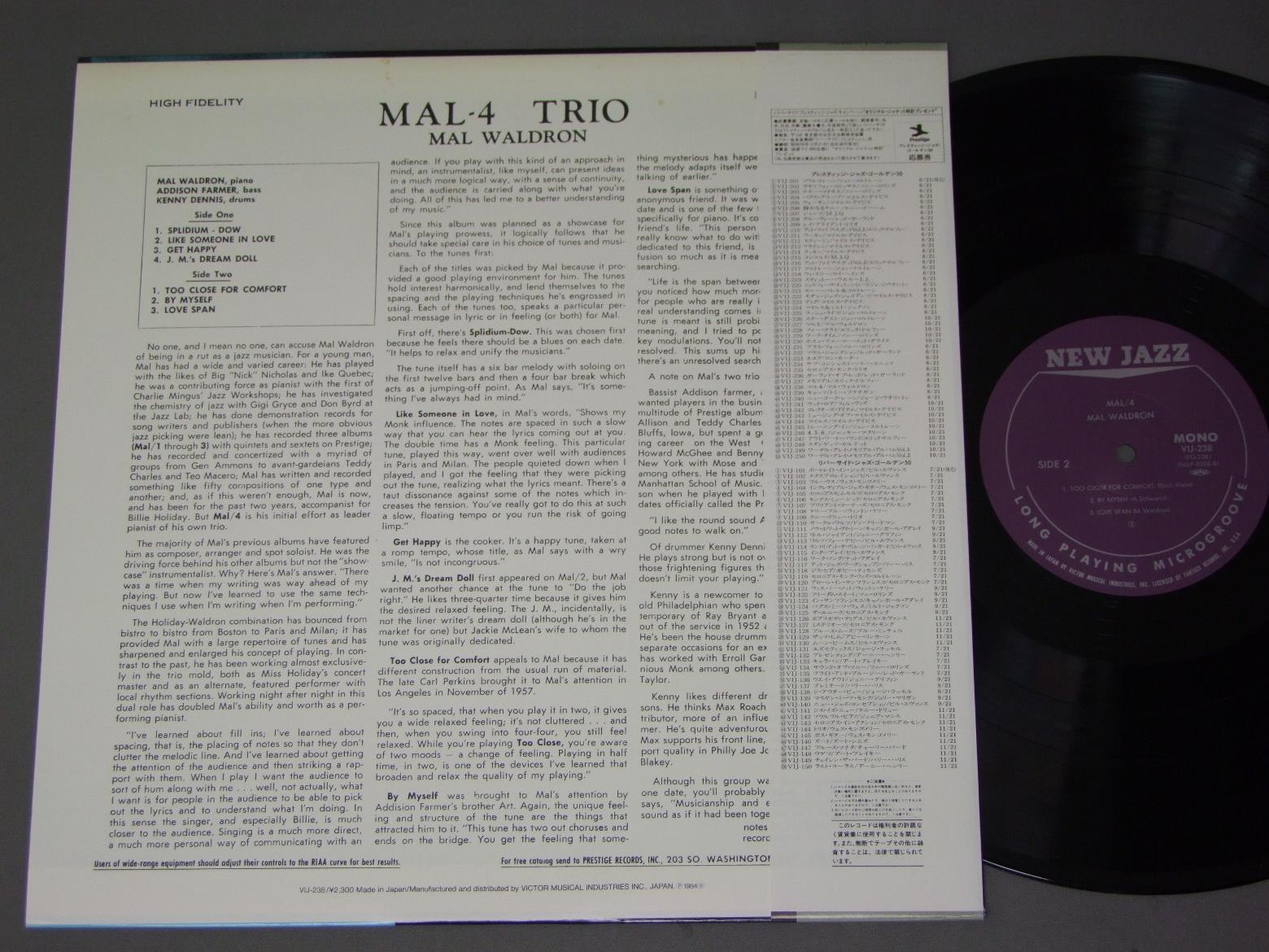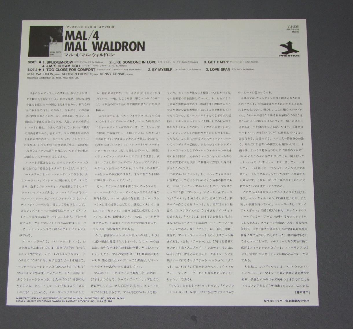 MAL WALDRONマル・ウォルドロン/MAL/4マル-4 VIJ238 製造国:日本盤 / Media:LP外観:EX盤の状態:EX+帯:EX 価格(税込):¥1,257(売約済) 送料 7inch:定形外郵便 360円~LP:定形外郵便 660円~送料は、注文の最終画面で確認頂けます。 > > MAL WALDRON/MAL/4 外観 (EX)特記事項:裏ジャケ上ヘリ付近にシミが少し。外観EXの共通説明:ダメージが限定的。中古品としては保存状態がよい方。シミ、ヨゴレ、スレ 少し~軽度。 盤の状態 (EX+)特記事項:極薄いスリキズ・スレ少しだけ。一見してきれいな状態です。盤EX+の共通説明:盤面の極薄いスリキズ、スレ少し程度 音に出そうなものは無いように見える(極軽微なソフトティック音は除く)。 帯の状態 (EX):背側に日焼け。 その他:※画像では確認できない、上下ヘリ、背表紙、取り出し口を中心に状態表記しております。画像で確認出来る表裏ジャケ、レーベルの状態表記は省いている場合がありますので、そちらの状態は画像でご確認をお願い致します。携帯の方は一度PC等で写真をご確認の上ご入札下さいますよう、お願い申し上げます。 Tweet それぞれの画像をクリックすると、大きい写真が見られます こちらの商品もお勧めです 770円 COZY COLE - RED NORVO etcコジー・コール - レッド・ノーヴォ他 / ALL STAR SESSIONSオール・スター・セッション 1,980円 YASUTAKA TSUTSUI + YOSUKE YAMASHITA etc筒井康隆 + 山下洋輔他 / INNER SPACE OF YASUTAKA TSUTSUI筒井康隆全集プレゼント INNER SPACE OF YASUTAKA TSUTSUI 990円 CHARLIE PARKERチャーリー・パーカー / CHARLIE PARKER ON SAVOY VOL4チャーリー・パーカー・オン・サヴォイVOL4 1,320円 SUNSET ALL STARSサンセット・オール・スターズ / JAMMIN` AT SUNSET VOL.2ジャミン・アット・サンセット 第2集 440円 SADAO WATANABE渡辺貞夫 / MORNING ISLANDモーニング・アイランド 1,210円 SONNY ROLLINSソニー・ロリンズ / DON`T ASKドント・アスク 1,320円 KAZUMI WATANABE-STEVE GADD etc渡辺香津美-スティーヴ・ガッド 他 / TEO MACERO PRESENTS IMPRESSIONS OF VIRUSテオ・マセロ・プレゼンツ 復活の日の印象 990円 SHOJI SUZUKI & HIS RHYTHM ACES鈴木章治とリズム・エース / SUZUKAKE NO MICHI新・鈴懸の径