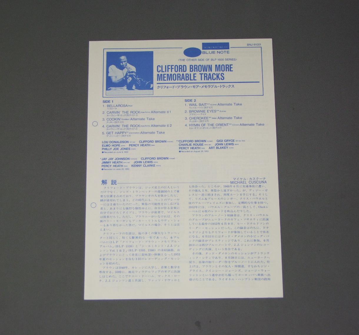 CLIFFORD BROWNクリフォード・ブラウン/CLIFFORD BROWN MORE MEMORABLE TRACKSクリフォード・ブラウン・モア・メモラブル・トラックス BNJ61001 製造国:日本盤 / Media:LP外観:EX+盤の状態:EX+帯:EX+ 価格(税込):¥1,540(売約済) 送料 7inch:定形外郵便 360円~LP:定形外郵便 660円~送料は、注文の最終画面で確認頂けます。 > > CLIFFORD BROWN/CLIFFORD BROWN MORE MEMORABLE TRACKS 外観 (EX+)特記事項:両面共厚手のコーティング仕様。外観EX+の共通説明:中古としては美品、一見してきれいでダメージが軽微。シミ、ヨゴレ、スレ有っても僅か~少し。 盤の状態 (EX+)特記事項:極薄いスリキズ・スレ少しだけ。一見してきれいな状態です。盤EX+の共通説明:盤面の極薄いスリキズ、スレ少し程度 音に出そうなものは無いように見える(極軽微なソフトティック音は除く)。 帯の状態 (EX+):特記なし。 その他:※画像では確認できない、上下ヘリ、背表紙、取り出し口を中心に状態表記しております。画像で確認出来る表裏ジャケ、レーベルの状態表記は省いている場合がありますので、そちらの状態は画像でご確認をお願い致します。携帯の方は一度PC等で写真をご確認の上ご入札下さいますよう、お願い申し上げます。 Tweet それぞれの画像をクリックすると、大きい写真が見られます こちらの商品もお勧めです 770円 ENSEMBLE NIPPONIA日本音楽集団 / WORKS OF KATSUTOSHI NAGASAWA (HOSHUN)長澤勝俊作品集萌春 1,210円 EUGEN CICEROオイゲン・キケロ・トリオ / ROKOKO-JAZZロココ・ジャズ 1,210円 BENNY GOODMAN TRIOベニーグッドマントリオ / PLAYS FOR FLETCHER HENDERSON FUNDプレイズ・フォー・ザ・フィレッチャー・ヘンダーソン 3,300円 EDDIE CONDON ALL STARSエディ・コンドン・オール・スターズ / EDDIE CONDON ALL STARS 1945 5LP BOX SETエディ・コンドン・オール・スターズ1945 5枚組 1,210円 BINGO MIKI & INNER GALAXY ORCHESTRA三木敏悟&インナー・ギャラクシー・オーケストラ / EVE(EIGHT LETTERS)出航前夜-一通の手紙 1,320円 TOSHIKO AKIYOSHI - LEW TABACKIN BIG BAND秋吉敏子=ルー・タバキン・ビッグ・バンド / INSIGHTSインサイツ 1,650円 HIDEIKO MATSUMOTO松本英彦 / PREDICTION風紀行 660円 CAL TJADERカル・ジェイダー / SHINING SEAシャイニング・シー