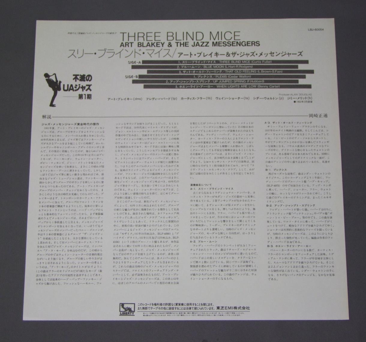 ART BLAKEY & THE JAZZ MESSENGERSアート・ブレイキー&ザ・ジャズ・メッセンジャーズ/3 BLIND MICEスリー・ブラインド・マイス LBJ60054 製造国:日本盤 / Media:LP外観:EX+盤の状態:EX+帯:EX+ 価格(税込):¥1,257(売約済) 送料 7inch:定形外郵便 360円~LP:定形外郵便 660円~送料は、注文の最終画面で確認頂けます。 > > ART BLAKEY & THE JAZZ MESSENGERS/3 BLIND MICE 外観 (EX+)特記事項:特記なし。外観EX+の共通説明:中古としては美品、一見してきれいでダメージが軽微。シミ、ヨゴレ、スレ有っても僅か~少し。 盤の状態 (EX+)特記事項:極薄いスリキズ・スレ少しだけ。一見してきれいな状態です。盤EX+の共通説明:盤面の極薄いスリキズ、スレ少し程度 音に出そうなものは無いように見える(極軽微なソフトティック音は除く)。 帯の状態 (EX+):特記なし。 その他:※画像では確認できない、上下ヘリ、背表紙、取り出し口を中心に状態表記しております。画像で確認出来る表裏ジャケ、レーベルの状態表記は省いている場合がありますので、そちらの状態は画像でご確認をお願い致します。携帯の方は一度PC等で写真をご確認の上ご入札下さいますよう、お願い申し上げます。 Tweet それぞれの画像をクリックすると、大きい写真が見られます こちらの商品もお勧めです 1,210円 WILLIE SMITH - JESS STACY - JOE SULLIVANジェス・ステイシー - ウィリイ・スミス - ジョー・サリバン / CHAIRMEN OF THE BOARD VOL2ピアノ・ジャズの競演 第2集 770円 TOSHIYUKI ICHIMURA市村俊幸 / MY LIFE MY PIANO 770円 RAY BAYANT TRIOレイ・ブライアント・トリオ / CON ALMAコン・アルマ 770円 LIONEL HAMPTONライオネル・ハンプトン楽団 / LIONEL HAMPTON ON TOURニュー・コンサート 1,210円 HERBIE MANNハービー・マン / MEMPHIS UNDERGROUNDメンフィス・アンダーグラウンド 1,320円 KAZUMI WATANABE-STEVE GADD etc渡辺香津美-スティーヴ・ガッド 他 / TEO MACERO PRESENTS IMPRESSIONS OF VIRUSテオ・マセロ・プレゼンツ 復活の日の印象 990円 HERBIE MANNハービー・マン / HERBIE MANN VOL12ハービー・マン VOL12 770円 LAMBERT-HENDRICKS & ROSS / SING ALONG WITH BASIEシング・アロング・ウィズ・べイシー
