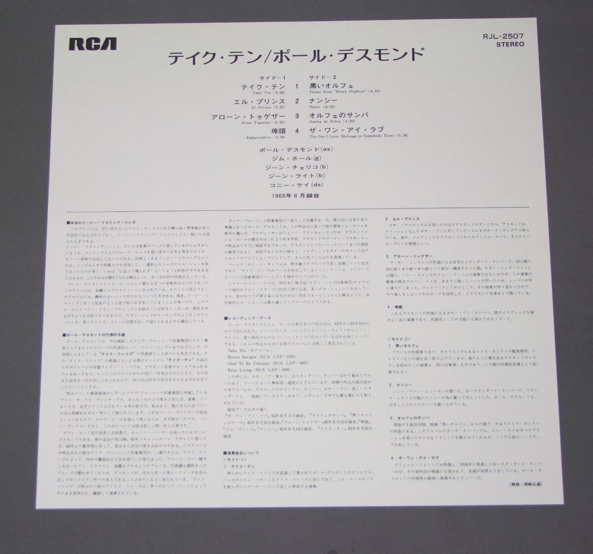 PAUL DESMONDポール・デスモンド/TAKE TENテイク・テン RJL2507 製造国:日本盤 / Media:LP外観:EX盤の状態:EX+帯:EX 価格(税込):¥1,210(売約済) 送料 7inch:定形外郵便 360円~LP:定形外郵便 660円~送料は、注文の最終画面で確認頂けます。 > > PAUL DESMOND/TAKE TEN 外観 (EX)特記事項:上ヘリにスレが僅か。外観EXの共通説明:ダメージが限定的。中古品としては保存状態がよい方。シミ、ヨゴレ、スレ 少し~軽度。 盤の状態 (EX+)特記事項:極薄いスリキズ・スレ少しだけ。一見してきれいな状態です。盤EX+の共通説明:盤面の極薄いスリキズ、スレ少し程度 音に出そうなものは無いように見える(極軽微なソフトティック音は除く)。 帯の状態 (EX):特記なし。 その他:※画像では確認できない、上下ヘリ、背表紙、取り出し口を中心に状態表記しております。画像で確認出来る表裏ジャケ、レーベルの状態表記は省いている場合がありますので、そちらの状態は画像でご確認をお願い致します。携帯の方は一度PC等で写真をご確認の上ご入札下さいますよう、お願い申し上げます。 Tweet それぞれの画像をクリックすると、大きい写真が見られます こちらの商品もお勧めです 1,650円 KEITH JARRETTキース・ジャレット / DEATH AND THE FLOWER生と死の幻想 660円 CAL TJADERカル・ジェイダー / SHINING SEAシャイニング・シー 1,650円 DOLLAR BRANDダラー・ブランド / AFRICAN PIANOアフリカン・ピアノ 770円 KAI WINDING & J.J.JOHNSONケイ・ウィンディング5重奏団 + J.J.ジョンソン / AFTERNOON AT BIRDLANDバードランドのJ & K 1,210円 BUCK CLAYTON SEPTETバック・クレイトン / BUCKIN` THE BLUESバッキン・ザ・ブルース 770円 HERBIE MANNハービー・マン / HOLD ON. I`M COMIN`ホールド・オン 1,320円 GERY PEACOCKゲーリー・ピーコック / TALES OF ANOTHERTALES OF ANOTHER 1,210円 EUGEN CICEROオイゲン・キケロ・トリオ / ROKOKO-JAZZロココ・ジャズ