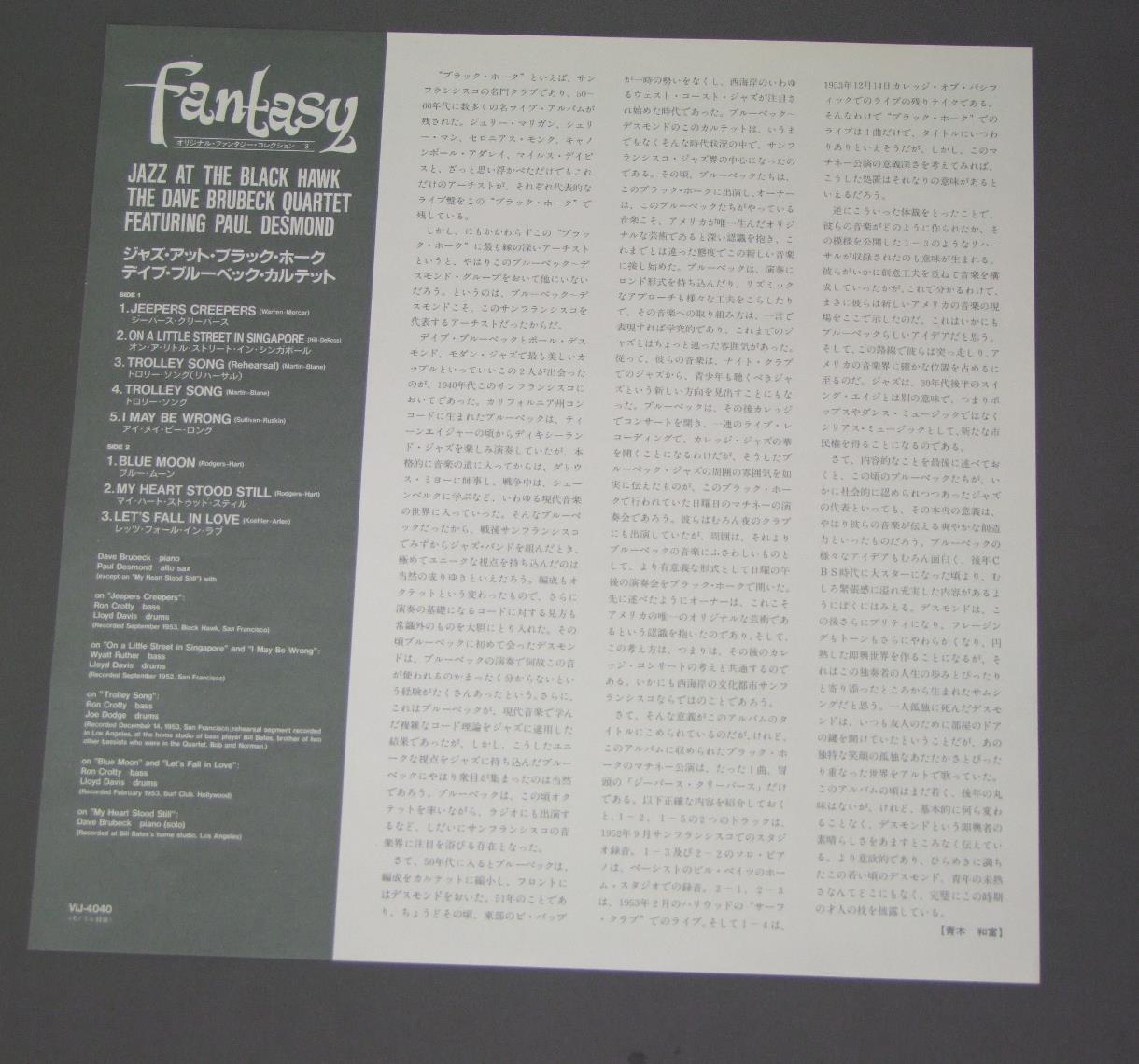 DAVE BRUBECK QUARTETデイブ・ブルーベック・カルテット/JAZZ AT THE BLACK HAWKジャズ・アット・ブラック・ホーク VIJ4040 製造国:日本盤 / Media:LP外観:EX盤の状態:EX+帯:EX+ 価格(税込):¥1,257(売約済) 送料 7inch:定形外郵便 360円~LP:定形外郵便 660円~送料は、注文の最終画面で確認頂けます。 > > DAVE BRUBECK QUARTET/JAZZ AT THE BLACK HAWK 外観 (EX)特記事項:裏ジャケ上ヘリ付近に日焼け軽。外観EXの共通説明:ダメージが限定的。中古品としては保存状態がよい方。シミ、ヨゴレ、スレ 少し~軽度。 盤の状態 (EX+)特記事項:極薄いスリキズ・スレ少しだけ。一見してきれいな状態です。盤EX+の共通説明:盤面の極薄いスリキズ、スレ少し程度 音に出そうなものは無いように見える(極軽微なソフトティック音は除く)。 帯の状態 (EX+):特記なし。 Tweet それぞれの画像をクリックすると、大きい写真が見られます こちらの商品もお勧めです 1,210円 EARL HINESアール・ハインズ / SPONT ANEOUS EXPLORATIONSアール・ハインズ・ソロ・ピアノ 990円 TERUMASA HINO日野皓正 / JOURNEY INTO MY MIND 1,320円 GATO BARBIERIガトー・バルビエリ / TROPICOトロピコ 990円 PETER SPRAGUEピーター・スプラッチ / MUSICA DEL MARムジカ・デル・マール 990円 YOSHIAKI MASUO増尾好秋 / SAILING WONDERセイリング・ワンダー 770円 ENSEMBLE NIPPONIA日本音楽集団 / WORKS OF KATSUTOSHI NAGASAWA (HOSHUN)長澤勝俊作品集萌春 1,210円 JAMES MOODYジェームス・ムーディ / EMARCY JAMES MOODY - THE COMPLETE MOODY STORYコンプリート・ジェームス・ムーディ・オン・エマーシー 1,320円 GREAT JAZZ TRIOグレート・ジャズ・トリオ / AT THE VILLAGE VANGUARD VOL2アット・ザ・ヴィレッジ・ヴァンガードVOL2
