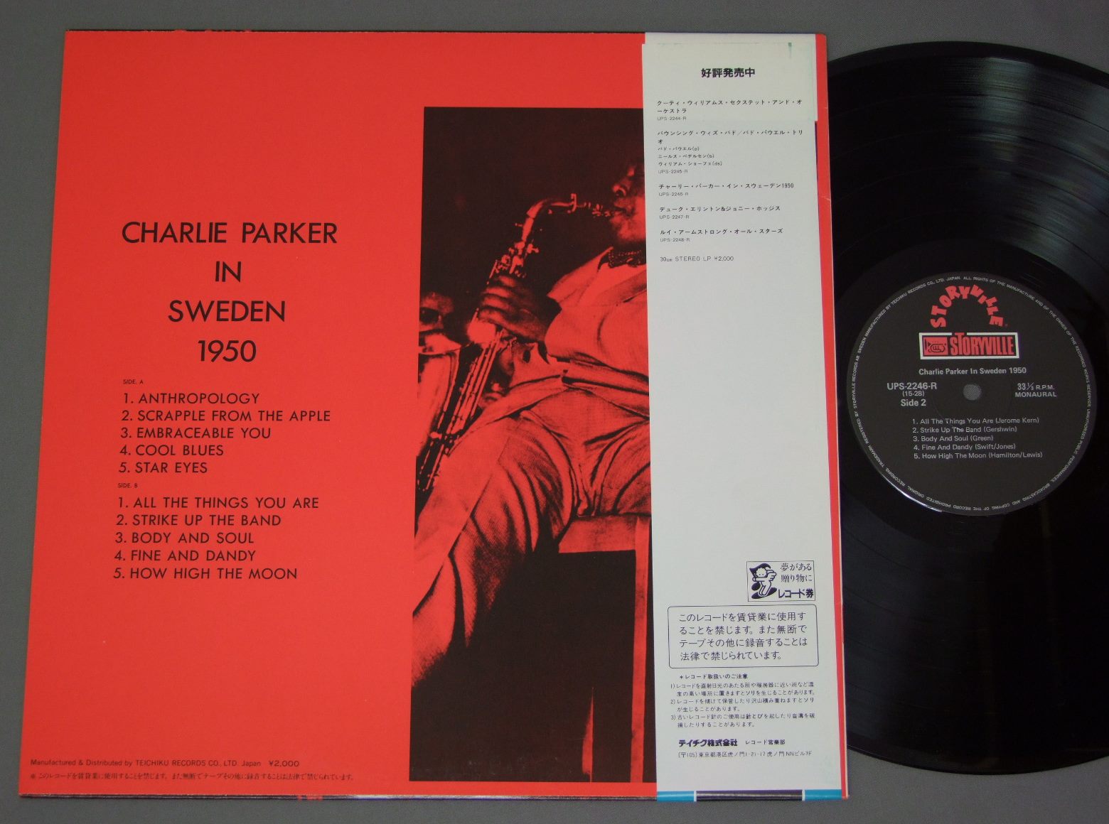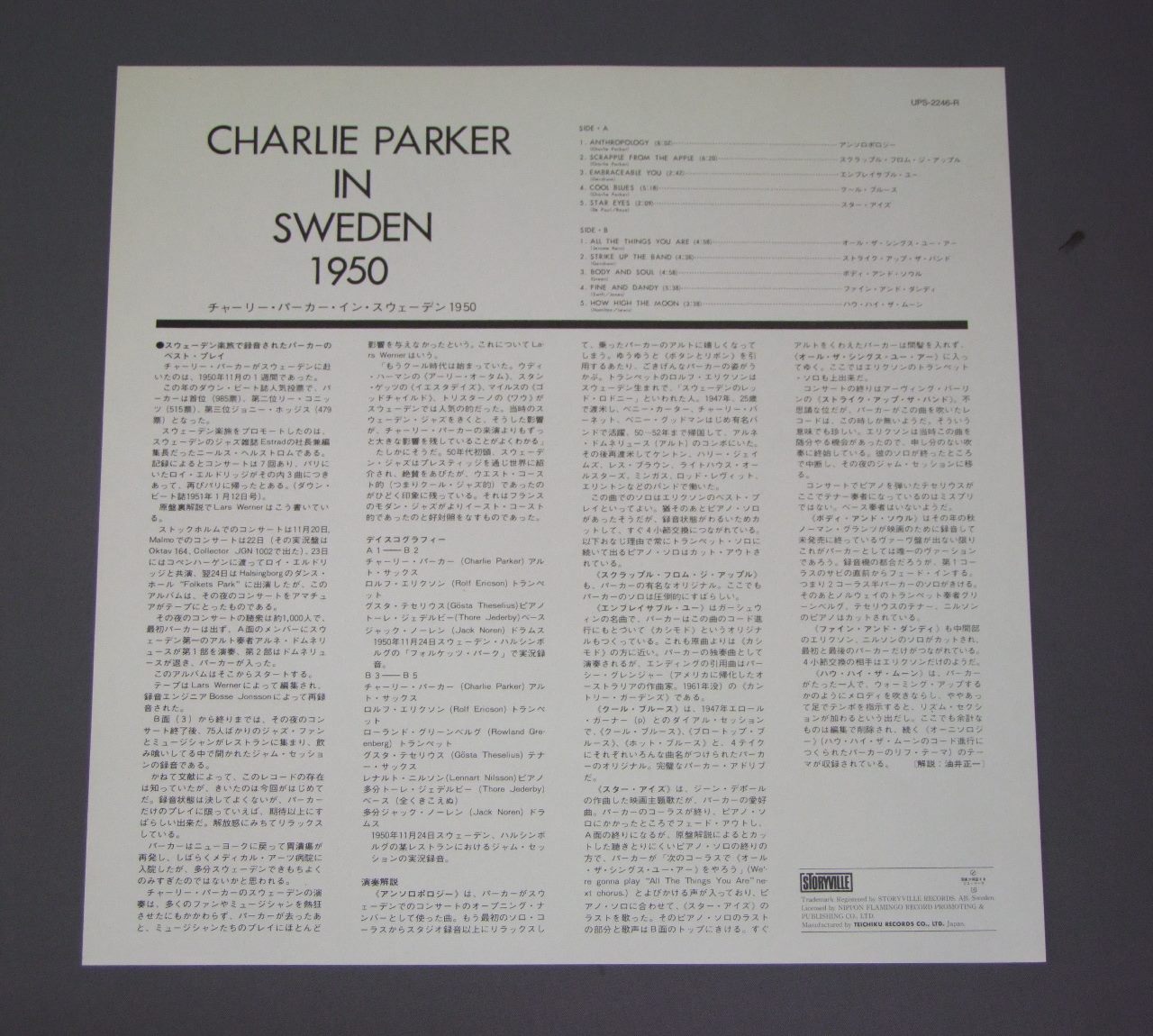 CHARLIE PARKERチャーリー・パーカー/CHARLIE PARKER IN SWEDEN 1950チャーリー・パーカー・イン・スウェーデン1950 UPS2246R 製造国:日本盤 / Media:LP外観:EX+盤の状態:EX+帯:EX+ 価格(税込):¥1,320(売約済) 送料 7inch:定形外郵便 360円~LP:定形外郵便 660円~送料は、注文の最終画面で確認頂けます。 > > CHARLIE PARKER/CHARLIE PARKER IN SWEDEN 1950 外観 (EX+)特記事項:裏ジャケの上ヘリ付近に薄い日焼け。外観EX+の共通説明:中古としては美品、一見してきれいでダメージが軽微。シミ、ヨゴレ、スレ有っても僅か~少し。 盤の状態 (EX+)特記事項:極薄いスリキズ・スレ少しだけ。一見してきれいな状態です。盤EX+の共通説明:盤面の極薄いスリキズ、スレ少し程度 音に出そうなものは無いように見える(極軽微なソフトティック音は除く)。 帯の状態 (EX+):特記なし。 Tweet それぞれの画像をクリックすると、大きい写真が見られます こちらの商品もお勧めです 1,650円 MASABUMI KIKUCHI + GIL EVANS菊池雅章 / SAME TITLEWITH ギル・エヴァンス 1,210円 JIMMY SMITHジミー・スミス / PORTUGUESE SOULポルトガル・ソウル 770円 RICHARD RODNEY BENNETTリチャード・ロドニー・ベネット / I GOT RHYTHMアイ・ゴット・リズム 1,320円 YOSHITAKA AKIMITSU秋満義孝 / VIVRE POUR VIVREパリのめぐり逢い 770円 TEDDY WILSONテディ・ウイルソン / NOBLE ART OF TEDDY WILSONノーブル・アート・オブ・テディ・ウイルソン 990円 MODERN JAZZ QUARTETモダン・ジャズ・クワルテット / IN MEMORIAMイン・メモリアル 1,320円 EDDIE COSTA TRIOエディ・コスタ・トリオ / HOUSE OF BLUE LIGHTSハウス・オブ・ブルー・ライツ 880円 MASAMI NAKAGAWA中川昌三 / PRELUDE FOR AUTUMNプレリュード・フォー・オータム