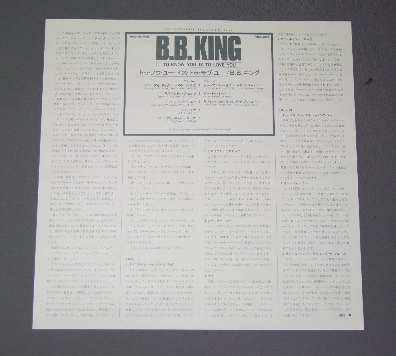 B.B.KINGB.B.キング/TO KNOW YOU IS TO LOVE YOUトゥ・ノウ・ユー・イズ・トゥ・ラヴ・ユー VIM4064 製造国:日本盤 / Media:LP外観:EX+盤の状態:EX+帯:EX 価格(税込):¥1,100(売約済) 送料 7inch:定形外郵便 360円~LP:定形外郵便 660円~送料は、注文の最終画面で確認頂けます。 > > B.B.KING/TO KNOW YOU IS TO LOVE YOU 外観 (EX+)特記事項:特記なし。外観EX+の共通説明:中古としては美品、一見してきれいでダメージが軽微。シミ、ヨゴレ、スレ有っても僅か~少し。 盤の状態 (EX+)特記事項:極薄いスリキズ・スレ少しだけ。一見してきれいな状態です。盤EX+の共通説明:盤面の極薄いスリキズ、スレ少し程度 音に出そうなものは無いように見える(極軽微なソフトティック音は除く)。 帯の状態 (EX):特記なし。 Tweet それぞれの画像をクリックすると、大きい写真が見られます こちらの商品もお勧めです 440円 Z.Z.HILLZ.Z.ヒル / Z.Z.HILLZ.Z.ヒル 1,210円 B.B.KINGB.B キング / LOVE ME TENDERラブ・ミ・テンダー 1,980円 BUTTERFIELD BLUES BANDバターフィールド・ブルース・バンド / KEEP ON MOVINGキープ・オン・ムービング
