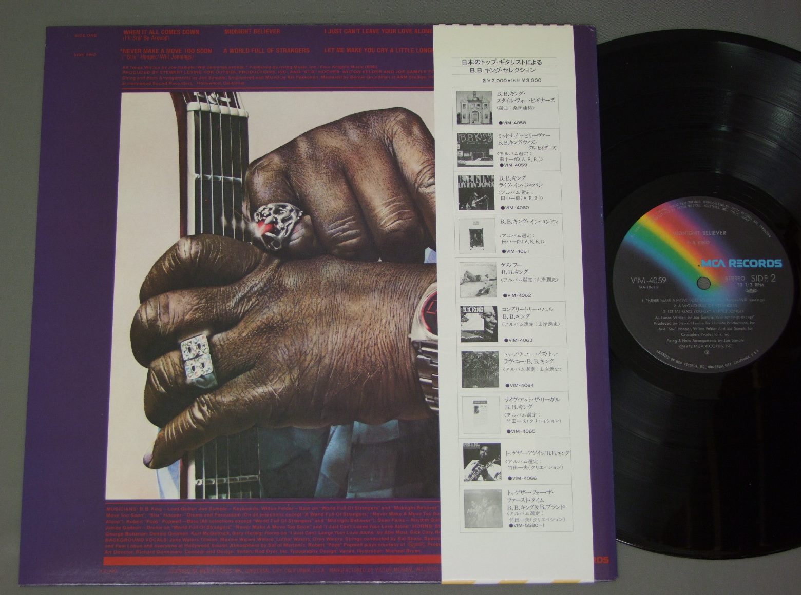 B.B.KINGB.B.キング/MIDNIGHT BELIEVERミッドナイト・ビリーヴァー VIM4059 製造国:日本盤 / Media:LP外観:EX+盤の状態:EX+帯:EX+ 価格(税込):¥1,047(売約済) 送料 7inch:定形外郵便 360円~LP:定形外郵便 660円~送料は、注文の最終画面で確認頂けます。 > > B.B.KING/MIDNIGHT BELIEVER 外観 (EX+)特記事項:特記なし。外観EX+の共通説明:中古としては美品、一見してきれいでダメージが軽微。シミ、ヨゴレ、スレ有っても僅か~少し。 盤の状態 (EX+)特記事項:極薄いスリキズ・スレ少しだけ。一見してきれいな状態です。盤EX+の共通説明:盤面の極薄いスリキズ、スレ少し程度 音に出そうなものは無いように見える(極軽微なソフトティック音は除く)。 帯の状態 (EX+):特記なし。 その他:※画像では確認できない、上下ヘリ、背表紙、取り出し口を中心に状態表記しております。画像で確認出来る表裏ジャケ、レーベルの状態表記は省いている場合がありますので、そちらの状態は画像でご確認をお願い致します。携帯の方は一度PC等で写真をご確認の上ご入札下さいますよう、お願い申し上げます。 Tweet それぞれの画像をクリックすると、大きい写真が見られます こちらの商品もお勧めです 440円 Z.Z.HILLZ.Z.ヒル / Z.Z.HILLZ.Z.ヒル 1,980円 BUTTERFIELD BLUES BANDバターフィールド・ブルース・バンド / KEEP ON MOVINGキープ・オン・ムービング 1,210円 B.B.KINGB.B キング / LOVE ME TENDERラブ・ミ・テンダー