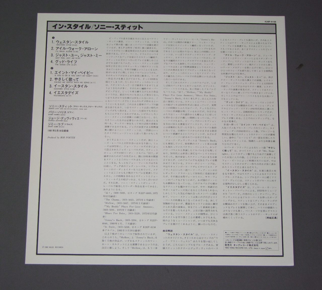 SONNY STITTソニー・ステッィト/IN STYLEイン・スタイル K26P6158 製造国:日本盤 / Media:LP外観:EX盤の状態:EX+帯:EX 価格(税込):¥1,320(売約済) 送料 7inch:定形外郵便 360円~LP:定形外郵便 660円~送料は、注文の最終画面で確認頂けます。 > > SONNY STITT/IN STYLE 外観 (EX)特記事項:特記なし。外観EXの共通説明:ダメージが限定的。中古品としては保存状態がよい方。シミ、ヨゴレ、スレ 少し~軽度。 盤の状態 (EX+)特記事項:極薄いスリキズ・スレ少しだけ。一見してきれいな状態です。盤EX+の共通説明:盤面の極薄いスリキズ、スレ少し程度 音に出そうなものは無いように見える(極軽微なソフトティック音は除く)。 帯の状態 (EX):特記なし。 Tweet それぞれの画像をクリックすると、大きい写真が見られます こちらの商品もお勧めです 2,200円 TADAO HAYASHI林忠男 / LYRAリラ 1,650円 COZY POWELLコージー・パウエル / TILTサンダーストーム 1,320円 KAZUMI WATANABE-STEVE GADD etc渡辺香津美-スティーヴ・ガッド 他 / TEO MACERO PRESENTS IMPRESSIONS OF VIRUSテオ・マセロ・プレゼンツ 復活の日の印象 770円 TOSHIYUKI ICHIMURA市村俊幸 / MY LIFE MY PIANO 1,320円 JACKIE McLEAN QUINTETジャッキー・マクリーン・クインテット / JACKIE McLEAN QUINTETJACIE McLEAN QUINTET 1,320円 BUD POWELLバド・パウエル / BUD POWELL TRIOバド・パウエル トリオ 990円 FORCEフォース / SECOND FORCEセカンド・フォース 1,320円 THE QUINTETパーカー - ガレスピー - パウエル - ローチ - ミンガス / JAZZ AT MASSEY HALLジャズ・アット・マッセイ・ホール