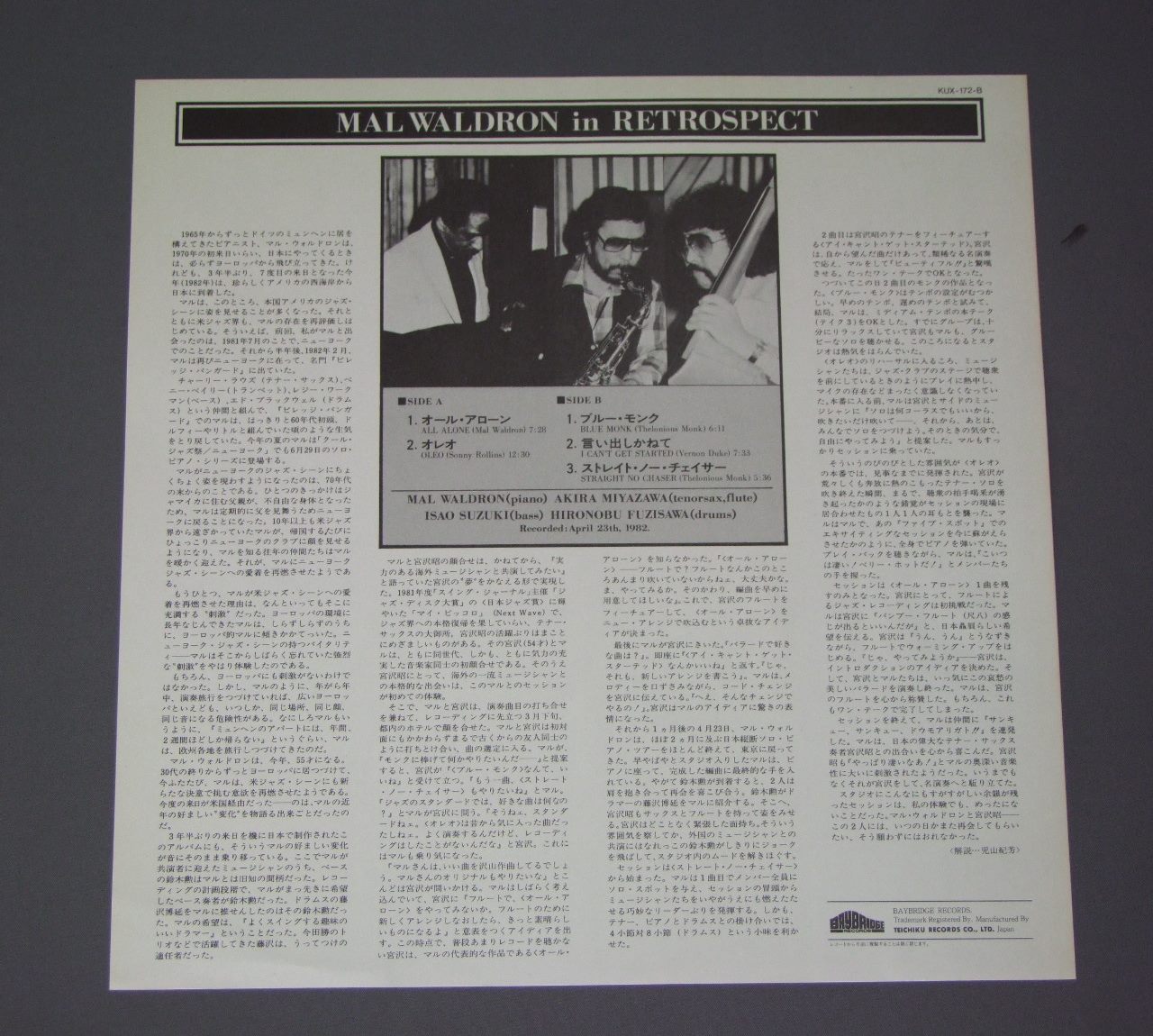 MAL WALDRONマル・ウォルドロン/MAL WALDRON IN RETROSPECTマル・ウォルドロン・イン・レトロスペクト KUX172B 製造国:日本盤 / Media:LP外観:EX盤の状態:EX帯:EX+ 価格(税込):¥1,100(売約済) 送料 7inch:定形外郵便 360円~LP:定形外郵便 660円~送料は、注文の最終画面で確認頂けます。 > > MAL WALDRON/MAL WALDRON IN RETROSPECT 外観 (EX)特記事項:特記なし。外観EXの共通説明:ダメージが限定的。中古品としては保存状態がよい方。シミ、ヨゴレ、スレ 少し~軽度。 盤の状態 (EX)特記事項:薄いスリキズ・スレ少しある感じ。一見してきれいな印象です。盤EXの共通説明:盤面のスリキズが薄いものが少し~軽度 音に出そうなものは無いように見える(軽微なソフトティック音は除く)。 帯の状態 (EX+):特記なし。 Tweet それぞれの画像をクリックすると、大きい写真が見られます こちらの商品もお勧めです 1,320円 HERBIE MANNハービー・マン楽団 / ST.THOMAS 60s ISSUEセント・トーマス ペラジャケ 770円 HAL McKUSICKハル・マジック / JAZZ WORKSHOPジャズ・ワークショップ 770円 TONY SCOTT QUINTETトニー・スコット・クワルテット / TONY SCOTT QUINTET 1,210円 CLARKE BOLAND BIG BAND / SAME TITEL 1,650円 HIDEIKO MATSUMOTO松本英彦 / PREDICTION風紀行 880円 JOE SULLIVAN-JESS STACY-WILLIE THE LION SMITH etcジョー・ブシュキン-ジェス・スティシー-ウィリーザ・ライオンスミス 他 / CHAIRMEN OF THE BOARD VOL2ピアノ・ジャズの競演 第2集 1,210円 DEREK SMITHディレク・スミス / NEW SOILニュー・ソワール 1,210円 ART FARMER AND THE ORCHESTRAアート・ファーマー楽団 / LISTEN TO ART FARMER AND THE ORCHESTRA 60s ISSUEアート・ファーマーの芸術 ペラジャケ