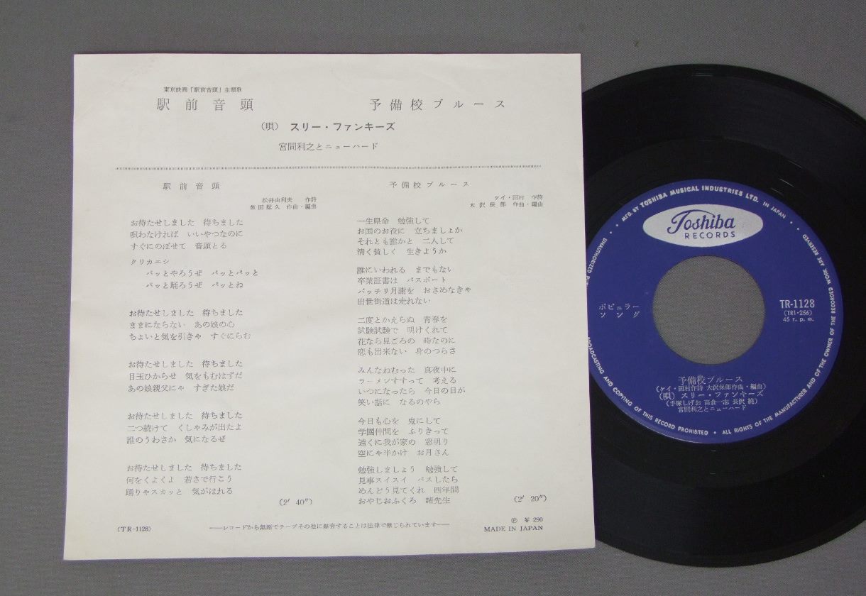 スリー・ファンキーズ/ 映画「駅前音頭」駅前音頭 TR1128 製造国:日本盤 / Media:7inch外観:EX盤の状態:EX 価格(税込):¥880(売約済) 送料 7inch:定形外郵便 360円~LP:定形外郵便 660円~送料は、注文の最終画面で確認頂けます。 > > / 外観 (EX)特記事項:ヨレや折れ多少有り。外観EXの共通説明:ダメージが限定的。中古品としては保存状態がよい方。シミ、ヨゴレ、スレ 少し~軽度。 盤の状態 (EX)特記事項:薄いスリキズ・スレ少しある感じ。一見してきれいな印象です。盤EXの共通説明:盤面のスリキズが薄いものが少し~軽度 音に出そうなものは無いように見える(軽微なソフトティック音は除く)。 Tweet それぞれの画像をクリックすると、大きい写真が見られます こちらの商品もお勧めです 880円 LETTERMENレターメン / LOVE BOOK愛の世界 770円 ELVIS PRESLEYエルヴィス・プレスリー / ELVIS VOL2 A LEGENDARY PERFORMER + BOOKLETエルヴィス・プレスリーの歴史 VOL2 770円 ELVIS PRESLEYエルヴィス・プレスリー / THAT`S THE WAY IT IS映画 エルヴィス・オン・ステージ 990円 VENTURESベンチャーズ / ROOK`N`ROLL GRAFFITIロックン・ロール・グラフィティ 990円 VENTURESベンチャーズ / IN CHRISTMASイン・クリスマス 770円 VARIOUS ARTISTS / YESTERDAY`S HITSイエスタデイズ・ヒッツ 990円 RICK NELSONリック・ネルソン / ALBUM SEVEN BY RICKアルバム・セブン・バイ・リック 440円 VENTURESベンチャーズ / POPS IN JAPANポップス・イン・ジャパン