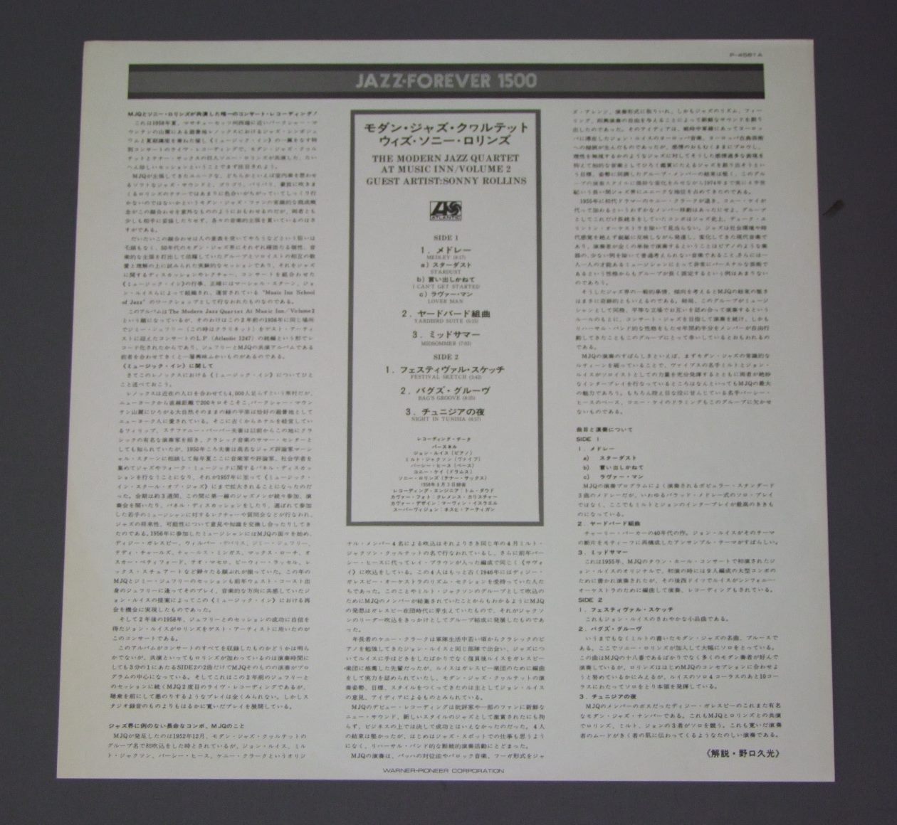 MODERN JAZZ QUARTETモダン・ジャズ・クヮルテット/AT MUSIC INN VOL2 GUEST ARTIST SONNY ROLLINS P4561A 製造国:日本盤 / Media:LP外観:EX-盤の状態:EX+ 価格(税込):¥1,047(売約済) 送料 7inch:定形外郵便 360円~LP:定形外郵便 660円~送料は、注文の最終画面で確認頂けます。 > > MODERN JAZZ QUARTET/AT MUSIC INN VOL2 GUEST ARTIST SONNY ROLLINS 外観 (EX-)特記事項:上下ヘリスレが少し。背に薄いよごれ。裏ジャケの上ヘリや背付近にシミ。外観EX-の共通説明:ダメージ軽度~多少。 中古品としては普通の状態。シミ、ヨゴレ、スレなど軽く~多少。 盤の状態 (EX+)特記事項:極薄いスリキズ・スレ少しだけ。一見してきれいな状態です。盤EX+の共通説明:盤面の極薄いスリキズ、スレ少し程度 音に出そうなものは無いように見える(極軽微なソフトティック音は除く)。 その他:※画像では確認できない、上下ヘリ、背表紙、取り出し口を中心に状態表記しております。画像で確認出来る表裏ジャケ、レーベルの状態表記は省いている場合がありますので、そちらの状態は画像でご確認をお願い致します。携帯の方は一度PC等で写真をご確認の上ご入札下さいますよう、お願い申し上げます。 Tweet それぞれの画像をクリックすると、大きい写真が見られます こちらの商品もお勧めです 880円 SADAO WATANABE渡辺貞夫 / MY DEAR LIFEマイ・ディア・ライフ 770円 TEDDY WILSONテディ・ウイルソン / NOBLE ART OF TEDDY WILSONノーブル・アート・オブ・テディ・ウイルソン 1,210円 MODERN JAZZ QUARTET + NEW YORK CHAMBER SYMPHONYMJQ + ニューヨーク・チェンバー・シンフォニー / THREE WINDOWSスリー・ウインドウズ 440円 MOE KOFFMAN / GOES ELECTRIC 1,210円 TERUMASA HINO日野皓正 / PYRAMIDピラミット 1,320円 HERBIE MANNハービー・マン楽団 / ST.THOMAS 60s ISSUEセント・トーマス ペラジャケ 770円 MAYNARD FERGUSON ORCH.メイナード・ファーガスン・オーケストラ / PRIMAL SCREAMクロスオーバー・ファーガスン 770円 BUDDY GRECOバディ・グレコ / BIG BAND&BALLADSビッグ・バンド・アンド・バラード