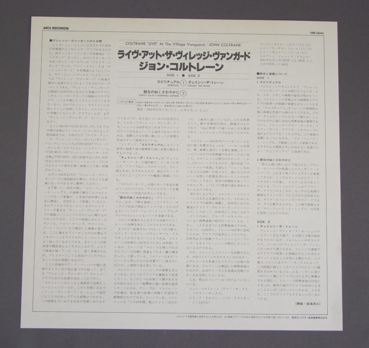 JOHN COLTRANEジョン・コルトレーン/LIVE AT THE VILLAGE VANGUARDライヴ・アット・ザ・ヴィレッジ・ヴァンガード VIM5640 製造国:日本盤 / Media:LP外観:EX+盤の状態:EX+帯:EX+ 価格(税込):¥1,100(売約済) 送料 7inch:定形外郵便 360円~LP:定形外郵便 660円~送料は、注文の最終画面で確認頂けます。 > > JOHN COLTRANE/LIVE AT THE VILLAGE VANGUARD 外観 (EX+)特記事項:特記なし。外観EX+の共通説明:中古としては美品、一見してきれいでダメージが軽微。シミ、ヨゴレ、スレ有っても僅か~少し。 盤の状態 (EX+)特記事項:極薄いスリキズ・スレ少しだけ。一見してきれいな状態です。盤EX+の共通説明:盤面の極薄いスリキズ、スレ少し程度 音に出そうなものは無いように見える(極軽微なソフトティック音は除く)。 帯の状態 (EX+):特記なし。 Tweet それぞれの画像をクリックすると、大きい写真が見られます こちらの商品もお勧めです 1,540円 TEDDY WILSONテデイ・ウイルソン / THE TEDDY WILSONザ・テデイ・ウイルソン 1,210円 ERIC DOLPHYエリック・ドルフィー / AT THE FIVE SPOTアット・ザ・5・スポットVOL2 1,210円 BENNY GOODMAN TRIOベニーグッドマントリオ / PLAYS FOR FLETCHER HENDERSON FUNDプレイズ・フォー・ザ・フィレッチャー・ヘンダーソン 1,210円 SONNY ROLLINS / PLAYS 1,210円 MODERN JAZZ QUARTETMJQ / ART OF THE MODERN JAZZ QUARTETアート・オブ・MJQ 1,210円 WYNTON KELLYウイントン・ケリー / KELLY BLUEケリー・ブルー 1,650円 TOM BROWNEトム・ブラウン / BROWNE SUGARブラウン・シュガー 770円 MATT DENNIS & RED NORVOマット・デニス & レッド・ノーヴォ / SOME OF MY FAVORITESサム・オブ・マイ・フェイバリッツ