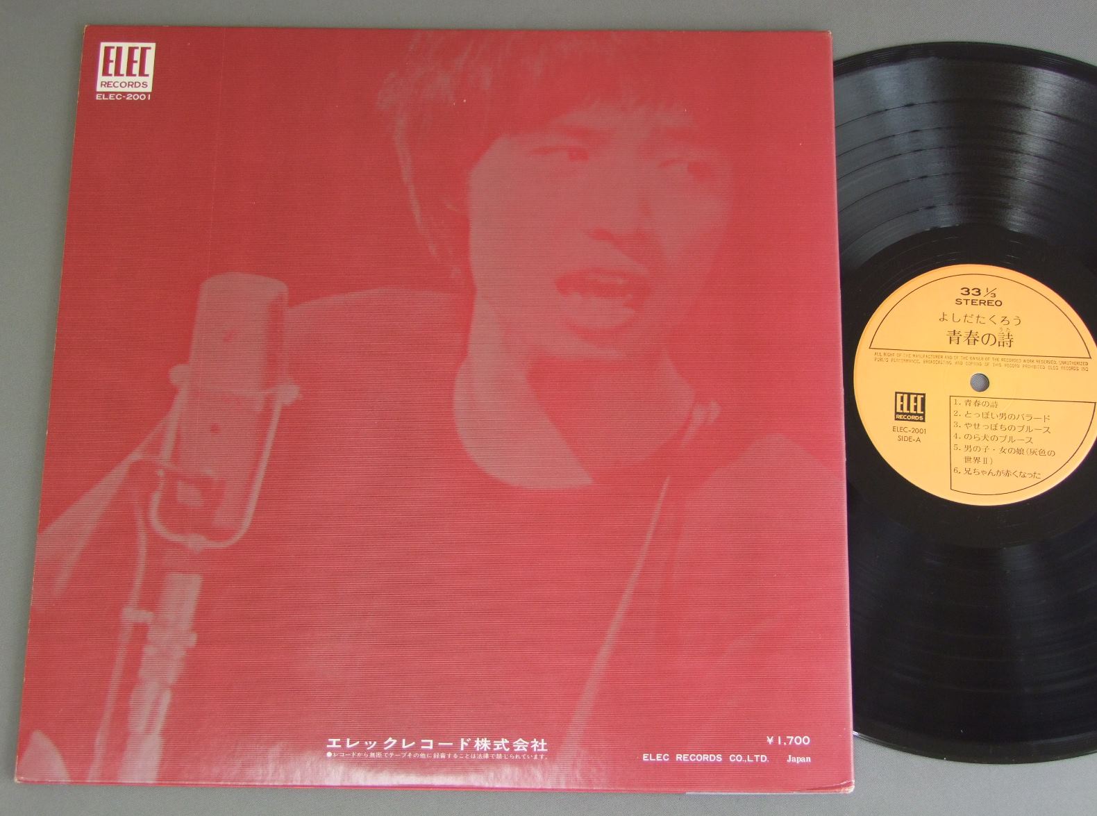 TAKURO YOSHIDAよしだたくろう/ 青春の詩 ELEC2001 製造国:日本盤 / Media:LP外観:EX-盤の状態:EX+帯:EX- 価格(税込):¥1,980(売約済) 送料 7inch:定形外郵便 360円~LP:定形外郵便 660円~送料は、注文の最終画面で確認頂けます。 > > TAKURO YOSHIDA/ 外観 (EX-)特記事項:見開きにシミ。ブックレットにシミ。外観EX-の共通説明:ダメージ軽度~多少。 中古品としては普通の状態。シミ、ヨゴレ、スレなど軽く~多少。 盤の状態 (EX+)特記事項:薄いスリキズ・スレ少し。一見してきれいな状態です。盤EX+の共通説明:盤面の極薄いスリキズ、スレ少し程度 音に出そうなものは無いように見える(極軽微なソフトティック音は除く)。 帯の状態 (EX-):表の下角で破れ。 Tweet それぞれの画像をクリックすると、大きい写真が見られます こちらの商品もお勧めです 1,980円 HAKO YAMAZAKI山崎ハコ / NINGEN MAGAI人間まがい 440円 KEMEケメ / KEME VOL.5愛そして卒業 ケメ-VOL.5 2,420円 ALL JAPAN FOLK JAMBORRE全日本フォークジャンボリー / LIVE 19711971 (出逢いの記録 その燃焼) 1,980円 FRUIDO古井戸 / YESTERDAYSイエスタデイズ 1,980円 SHOEBERTSはしだのりひことシューベルツ / MEET THE SHOEBERTS FEATURING NORIHIKO HASHIDA未完成 990円 NOBUYASU OKABAYASHI岡林信康 / DAREZO KONOKO NI AINOTE WO誰ぞこの子に愛の手を 770円 TAKURO YOSHIDAよしだたくろう / ON STAGEオン・ザ・ステージ ともだち 770円 IRUKAイルカ / NOEL`S FANTASTIC TRIPノエルの不思議な冒険