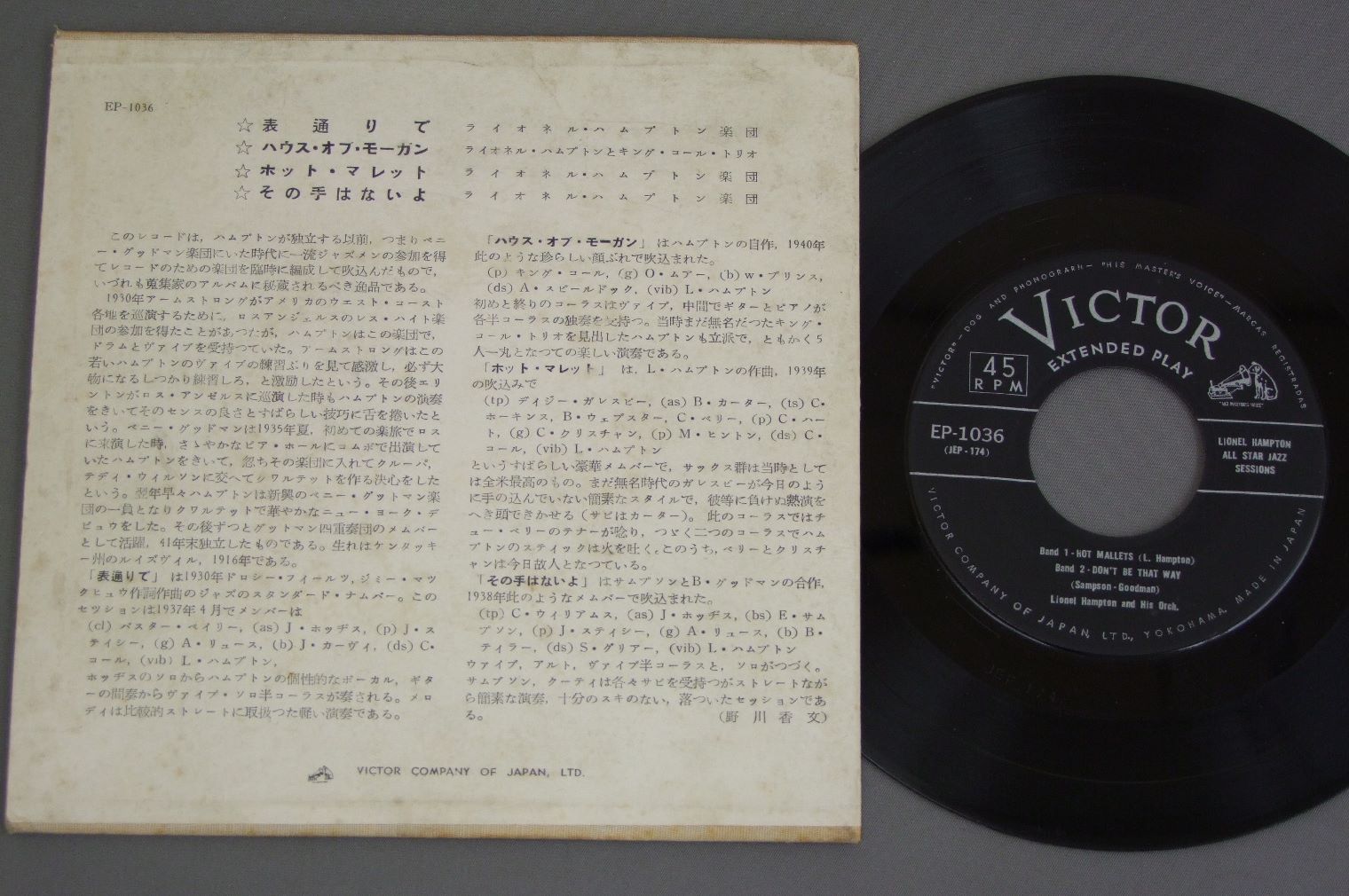 LIONEL HAMPTON/THIS IS JAZZ VOL.2 EP1036 製造国:日本盤 / Media:7inch外観:VG+盤の状態:EX- 価格(税込):¥770(売約済) 送料 7inch:定形外郵便 360円~LP:定形外郵便 660円~送料は、注文の最終画面で確認頂けます。 > > LIONEL HAMPTON/THIS IS JAZZ VOL.2 外観 (VG+)特記事項:背によごれ。表裏ジャケ共によごれ有り。外観VG+の共通説明:ダメージやや有り。シミ、ヨゴレ、スレなど多少~やや多め。 盤の状態 (EX-)特記事項:薄いスリキズ・細かい表面スレ多少ある感じ。殆どが軽微なものの様子です。盤EX-の共通説明:盤面のスリキズが多少有り。音に出そうなものは殆ど無いように見える~さほど気にならないぐらいの軽いプチ数カ所程度。 Tweet それぞれの画像をクリックすると、大きい写真が見られます こちらの商品もお勧めです 550円 BENNY GOODMANベニー・グッドマン / PLAYS JAZZ CLASSICS 1,210円 DUKE ELLINGTON & HIS ORCHESTRAデューク・エリントン楽団 / AT THE CARNEGIE HALL 1943 1,320円 BENNY GOODMANベニー・グッドマン / ON V-DISC VOL.2オン・Vディスク 第2集 770円 BENNY GOODMAN BANDベニー・グッドマン・バンド / BENNY GOODMAN BAND 1,320円 BENNY GOODMANベニー・グッドマン / BENNY`S BOP VOL.2ベニーズ・バップ 第2集 1,320円 TOMMY DORSEYトミー・ドーシー楽団他 / ORIGINAL TOMMY DORSEY BEST COLLECTIONオリジナル・トミー・ドーシー・ベスト・コレクション 440円 HARRY JAMES / JAZZ HISTORICAL RECORDINGS 1938 & 42 550円 LIONEL HAMPTON / 1944 & 46