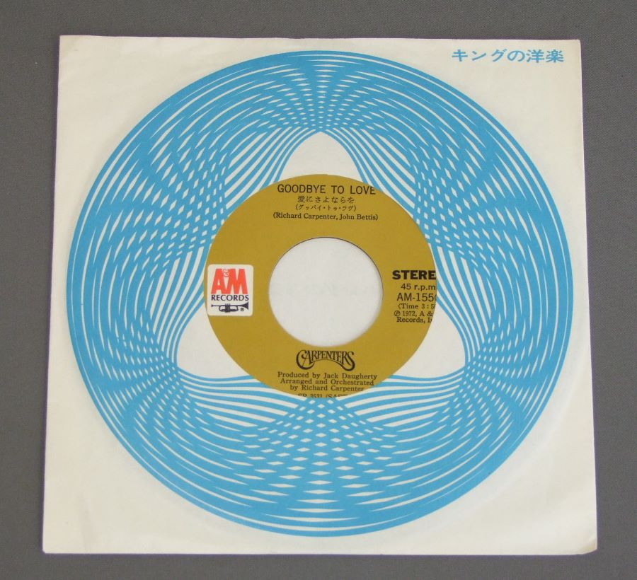 CARPENTERSカーペンターズ/GOODBYE TO LOVE愛にさよならを AM155 製造国:日本盤 / Media:7inch外観:EX盤の状態:EX+ 価格(税込):¥660(売約済) 送料 7inch:定形外郵便 360円~LP:定形外郵便 660円~送料は、注文の最終画面で確認頂けます。 > > CARPENTERS/GOODBYE TO LOVE 外観 (EX)特記事項:ヨレや折れ軽有り。外観EXの共通説明:ダメージが限定的。中古品としては保存状態がよい方。シミ、ヨゴレ、スレ 少し~軽度。 盤の状態 (EX+)特記事項:極薄いスリキズ・スレ少しだけ。一見してきれいな状態です。盤EX+の共通説明:盤面の極薄いスリキズ、スレ少し程度 音に出そうなものは無いように見える(極軽微なソフトティック音は除く)。 その他:※画像では確認できない、上下ヘリ、背表紙、取り出し口を中心に状態表記しております。画像で確認出来る表裏ジャケ、レーベルの状態表記は省いている場合がありますので、そちらの状態は画像でご確認をお願い致します。携帯の方は一度PC等で写真をご確認の上ご入札下さいますよう、お願い申し上げます。 Tweet それぞれの画像をクリックすると、大きい写真が見られます こちらの商品もお勧めです 770円 KIKI DEEキキ・ディー / KIKI DEE愛しのキキ・ディー 550円 RITA COORIDGEリタ・クーリッジ / HEARTBREAK RADIOハートブレイク・ラジオ 770円 OLIVIA NEWTON-JOHNオリビア・ニュートン・ジョン / DON`T STOP BELIEVIN`黄昏の恋 770円 PAT BENATARパット・べネター / IN THE HEART OF THE NIGHT真夜中の恋人達 770円 OLIVIA NEWTON-JOHNオリビア・ニュートン・ジョン / LET ME BE THEREセカンド・アルバム 770円 MERINA MERCOURIメリナ・メルクーリ / MERINA MERCOURIギリシャへの郷愁 770円 VERONIQUE SANSONヴェロニク・サンソン / VANCOUVER想い出 770円 OLIVIA NEWTON-JOHNオリビア・ニュートン・ジョン / HAVE YOU NEVER BEEN MELLOWそよ風の誘惑