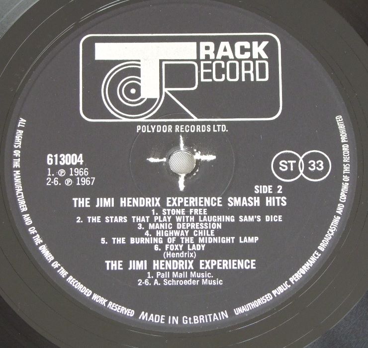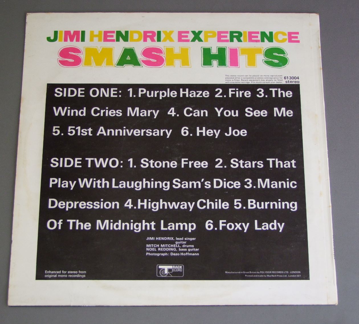 JIMI HENDRIX/SMASH HITS STEREO 613004 製造国:英国盤 / Media:LPMatrix:A▽1 | B//6 3を修正して6外観:EX盤の状態:VG+ 価格(税込):¥3,850(売約済) 送料 7inch:定形外郵便 360円~LP:定形外郵便 660円~送料は、注文の最終画面で確認頂けます。 > > JIMI HENDRIX/SMASH HITS STEREO 外観 (EX)特記事項:表ジャケは周辺部に多少コーティングシワは有りますが、全体的にスレやスリキズ等は薄い感じなのでしっかりした印象は有ります。裏ジャケもよごれなどは薄いものが中心。外観EXの共通説明:ダメージが限定的。中古品としては保存状態がよい方。シミ、ヨゴレ、スレ 少し~軽度。 盤の状態 (VG+)特記事項:薄いスリキズ・細かい表面スレ多少ある感じ。A2に溝に沿う感じのキズがありますが、針飛びはなく軽プチが少し出ていました。他A3、A4にも小キズで少しプチが有ります。他所々聴いてみましたが、チリプチは有りますが音自体もクリアーに鳴っていて十分に楽しめる音質打音もイます。盤VG+の共通説明:盤面にスリキズが多少~やや有り、音に出そうなものも多少ある。 Tweet それぞれの画像をクリックすると、大きい写真が見られます こちらの商品もお勧めです 4,400円 JIMI HENDRIX / MIDNIGHT LIGHTNING