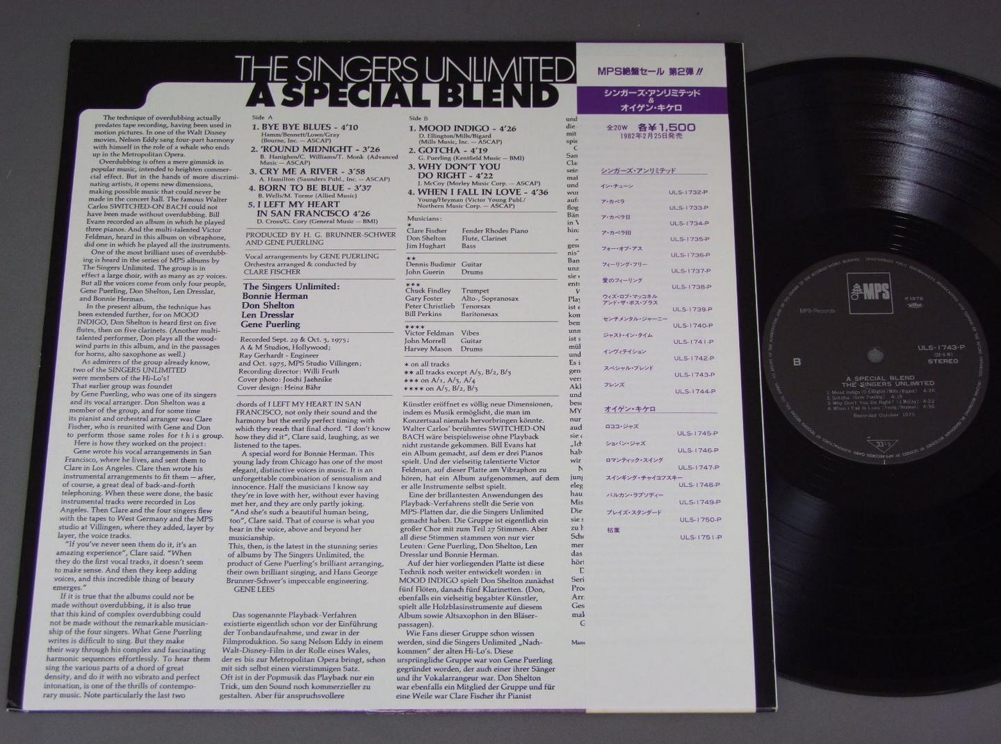 SINGERS UNLIMITEDシンガーズ・アンリミテッド/SPECIAL BLENDスペシャル・ブレンド ULS1743P 製造国:日本盤 / Media:LP外観:EX+盤の状態:EX+帯:EX+ 価格(税込):¥770(売約済) 送料 7inch:定形外郵便 360円~LP:定形外郵便 660円~送料は、注文の最終画面で確認頂けます。 > > SINGERS UNLIMITED/SPECIAL BLEND 外観 (EX+)特記事項:特記なし。外観EX+の共通説明:中古としては美品、一見してきれいでダメージが軽微。シミ、ヨゴレ、スレ有っても僅か~少し。 盤の状態 (EX+)特記事項:極薄いスリキズ・スレ少しだけ。一見してきれいな状態です。盤EX+の共通説明:盤面の極薄いスリキズ、スレ少し程度 音に出そうなものは無いように見える(極軽微なソフトティック音は除く)。 帯の状態 (EX+):特記なし。 Tweet それぞれの画像をクリックすると、大きい写真が見られます こちらの商品もお勧めです 770円 MITCH MILLER AND THE GANGミッチ・ミラー合唱団 / HOME CHORUS PARTY VOL2 60s ISSUEホーム・コーラス・パーティ 第2集 ペラジャケ 990円 NANCY WILSONナンシー・ウィルスン / NANCY WILSON BEST 20ナンシー・ウィルスン・ベスト20 1,320円 DELLA REESEデラ・リーズ / DELLA REESE LIVEデラ・リーズ・ライヴ 660円 PAUL ROBESONポール・ロブスン / PAUL ROBESON AT CARNEGIE HALLカーネギー・ホールのポール・ロブスン 1,650円 NAMI HIDAKA日高なみ / NAMI HIDAKA AUTOGRAPHED日高なみ サイン付 440円 MARI NAKAMOTO中本マリ / APHORODITEアフロディーの祈り 770円 SWINGLE SINGERSスイングル・シンガーズ / JAZZ SEBASTIEN BACHジャズ・セバスチャン・バッハ 1,320円 CARMEN McRAE AND JOE WILLIAMSカーメン・マクレエ & ジョー・ウイリアムス / IN CONCERTイン コンサート