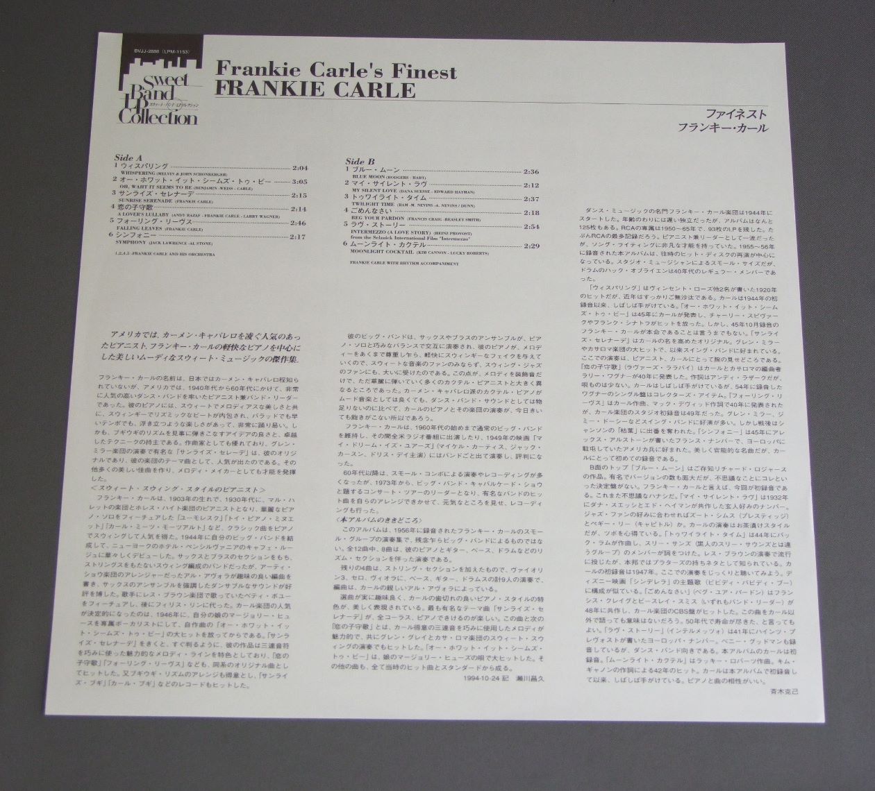 FRANKIE CARLEフランキー・カール/FRANKIE CARLE`S FINESTファイネスト LPM1153 製造国:日本盤 / Media:LP外観:EX+盤の状態:EX+ 価格(税込):¥660(売約済) 送料 7inch:定形外郵便 360円~LP:定形外郵便 660円~送料は、注文の最終画面で確認頂けます。 > > FRANKIE CARLE/FRANKIE CARLE`S FINEST 外観 (EX+)特記事項:両面共厚手のコーティング仕様。外観EX+の共通説明:中古としては美品、一見してきれいでダメージが軽微。シミ、ヨゴレ、スレ有っても僅か~少し。 盤の状態 (EX+)特記事項:極薄いスリキズ・スレ少しだけ。一見してきれいな状態です。盤EX+の共通説明:盤面の極薄いスリキズ、スレ少し程度 音に出そうなものは無いように見える(極軽微なソフトティック音は除く)。 Tweet それぞれの画像をクリックすると、大きい写真が見られます こちらの商品もお勧めです 880円 MICHAEL LORIMERマイケル・ロリマー / REMEMBRANZAリメンブランザ 660円 CUSCOクスコ / PLANET VOYAGE惑星旅行 770円 DAROL ANGER-BARBARA HIGBIEダロール・アンガー & バーバラ・ヒグビー / TIDELINEタイドライン 440円 RICHARD TRYTHALLリチャード・トライソール / SOLO PIANOアラベスク 660円 LAWRENCE WELK / LAWRENCE WELK AND HIS MUSICAL FAMILY CELEBRATE 50 YEARS IN MUSIC