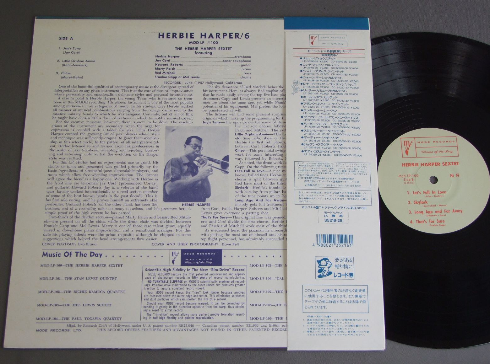 HERBIE HARPER SEXTETハービー・ハーパー・セクステット/HERBIE HARPER SEXTETハービー・ハーパー・セクステット MOD LP100 製造国:日本盤 / Media:LP外観:EX盤の状態:EX+帯:EX 価格(税込):¥990(売約済) 送料 7inch:定形外郵便 360円~LP:定形外郵便 660円~送料は、注文の最終画面で確認頂けます。 > > HERBIE HARPER SEXTET/HERBIE HARPER SEXTET 外観 (EX)特記事項:裏側にシミ。解説カード無し。外観EXの共通説明:ダメージが限定的。中古品としては保存状態がよい方。シミ、ヨゴレ、スレ 少し~軽度。 盤の状態 (EX+)特記事項:極薄いスリキズ・スレ少しだけ。一見してきれいな状態です。盤EX+の共通説明:盤面の極薄いスリキズ、スレ少し程度 音に出そうなものは無いように見える(極軽微なソフトティック音は除く)。 帯の状態 (EX):特記なし。 Tweet それぞれの画像をクリックすると、大きい写真が見られます こちらの商品もお勧めです 1,210円 MODERN JAZZ QUARTET + NEW YORK CHAMBER SYMPHONYMJQ + ニューヨーク・チェンバー・シンフォニー / THREE WINDOWSスリー・ウインドウズ 1,650円 COZY POWELLコージー・パウエル / TILTサンダーストーム 770円 SADAO WATANABE渡辺貞夫 / CALIFORNIA SHOWERカリフォルニア シャワー 990円 CHARLIE PARKERチャーリー・パーカー / CHARLIE PARKER ON SAVOY VOL6チャーリー・パーカー・オン・サヴォイVOL6 3,300円 EDDIE CONDON ALL STARSエディ・コンドン・オール・スターズ / EDDIE CONDON ALL STARS 1945 5LP BOX SETエディ・コンドン・オール・スターズ1945 5枚組 440円 MOE KOFFMAN / GOES ELECTRIC 440円 GARY BURTON - SONNY ROLLINS - CLARK TERRYG.バートン - S.ロリンズ - C.テリー / 3 IN JAZZスリー・イン・ジャズ 1,650円 ALBERT AYLERアルバート・アイラー / VOLUME 1ラスト・レコーディング VOL1