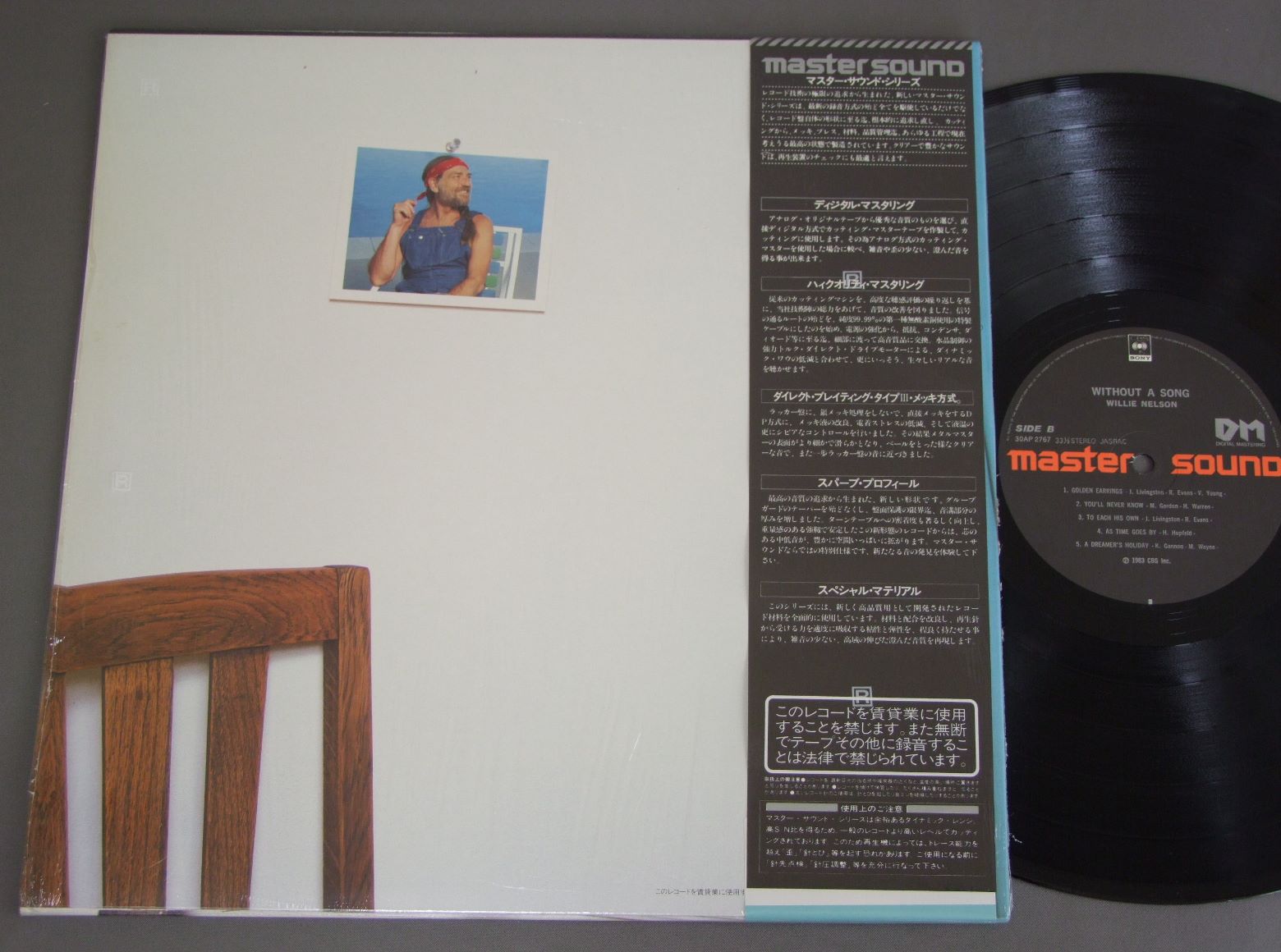 WILLIE NELSONウィリー・ネルソン/WITHOUT A SONG枯葉 MASTER SOUND盤 30AP2767 製造国:日本盤 / Media:LP外観:EX+盤の状態:EX+ 価格(税込):¥1,650(売約済) 送料 7inch:定形外郵便 360円~LP:定形外郵便 660円~送料は、注文の最終画面で確認頂けます。 > > WILLIE NELSON/WITHOUT A SONG 外観 (EX+)特記事項:特記なし。外観EX+の共通説明:中古としては美品、一見してきれいでダメージが軽微。シミ、ヨゴレ、スレ有っても僅か~少し。 盤の状態 (EX+)特記事項:極薄いスリキズ・スレ少し。一見してきれいな状態です。盤EX+の共通説明:盤面の極薄いスリキズ、スレ少し程度 音に出そうなものは無いように見える(極軽微なソフトティック音は除く)。 Tweet それぞれの画像をクリックすると、大きい写真が見られます こちらの商品もお勧めです 660円 AL STEWARTアル・スチュアート / TIME PASSAGESタイム・パッセージ 1,210円 TOMMY SHAWトミー・ショウ / GIRLS WITH GUNSガール・ウィズ・ガン 660円 JOHN DENVERジョン・デンバー / BACK HOME AGAINバック・ホーム・アゲイン 440円 JACKSON BROWNEジャクソン・ブラウン / LAWYERS IN LOVE愛の使者 1,210円 MICHEL POLNAREFFミッシェル・ポルナレフ / POLNAREF NOWポルナレフ・ナウ 880円 GRAHAM BONNET / LINE UP孤独のナイトゲーム 660円 ROBERT GOULETロバート・グーレ / SINCERELY YOURS 60s ISSUEニュー・トップ・ガイ ロバート・グーレは歌う ペラジャケ 1,320円 NICOLAS DE ANGELISニコラ・デ・アンジェリス / L`ESPAGNOLE ET VOYAGE悲しみのスペイン
