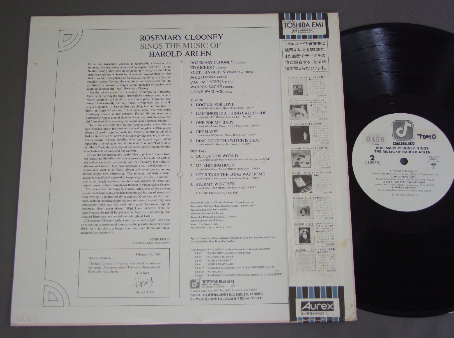 ROSEMARY CLOONEYローズマリー・クルーニー/ROSEMARY CLOONEY SINGS THE MUSIC OF HAROLD ARLENハロルド・アーレン作曲集 ICJ80236 製造国:日本盤 / Media:LP外観:VG+盤の状態:EX+帯:VG+ 価格(税込):¥1,100(売約済) 送料 7inch:定形外郵便 360円~LP:定形外郵便 660円~送料は、注文の最終画面で確認頂けます。 > > ROSEMARY CLOONEY/ROSEMARY CLOONEY SINGS THE MUSIC OF HAROLD ARLEN 外観 (VG+)特記事項:表ジャケ右下にステッカー跡。表裏ジャケ共に背下付近にシミ多め。外観VG+の共通説明:ダメージやや有り。シミ、ヨゴレ、スレなど多少~やや多め。 盤の状態 (EX+)特記事項:極薄いスリキズ・スレ少し。一見してきれいな状態です。盤EX+の共通説明:盤面の極薄いスリキズ、スレ少し程度 音に出そうなものは無いように見える(極軽微なソフトティック音は除く)。 帯の状態 (VG+):下ヘリに切れ。裏側にヨレやシミ。 Tweet それぞれの画像をクリックすると、大きい写真が見られます こちらの商品もお勧めです 1,210円 MODERN JAZZ QUARTET + NEW YORK CHAMBER SYMPHONYMJQ + ニューヨーク・チェンバー・シンフォニー / THREE WINDOWSスリー・ウインドウズ 1,320円 HERBIE MANNハービー・マン楽団 / ST.THOMAS 60s ISSUEセント・トーマス ペラジャケ 1,210円 DEREK SMITHディレク・スミス / NEW SOILニュー・ソワール 1,210円 FLETCHER HENDERSON & HIS ORCHESTRAフレッチャー・ヘンダーソン / FIRST IMPRESSIONS VOL1 (1924-1931)ファースト・インプレッションズ VOL1 (1924-1931) 1,650円 COZY POWELLコージー・パウエル / TILTサンダーストーム 660円 LALO SCHIFRINラロ・シフリン / BLACK WIDOWブラック・ウィンドウ 1,210円 DUKE ELLINGTON WITH JIMMY JONESデューク・エリントン & ジミー・ジョーンズ / DUKE ELLINGTON`S MY PEOPLEマイ・ピープル 770円 JACQUES LOUSSIER TRIO - ROYAL PHIL. ORCH.ジャック・ルーシェ・トリオ - ロイヤル・フィルハーモニー管弦楽団 / BACH - BRANDENBURG NO5バッハ - ブランデンブルグ協奏曲第5番