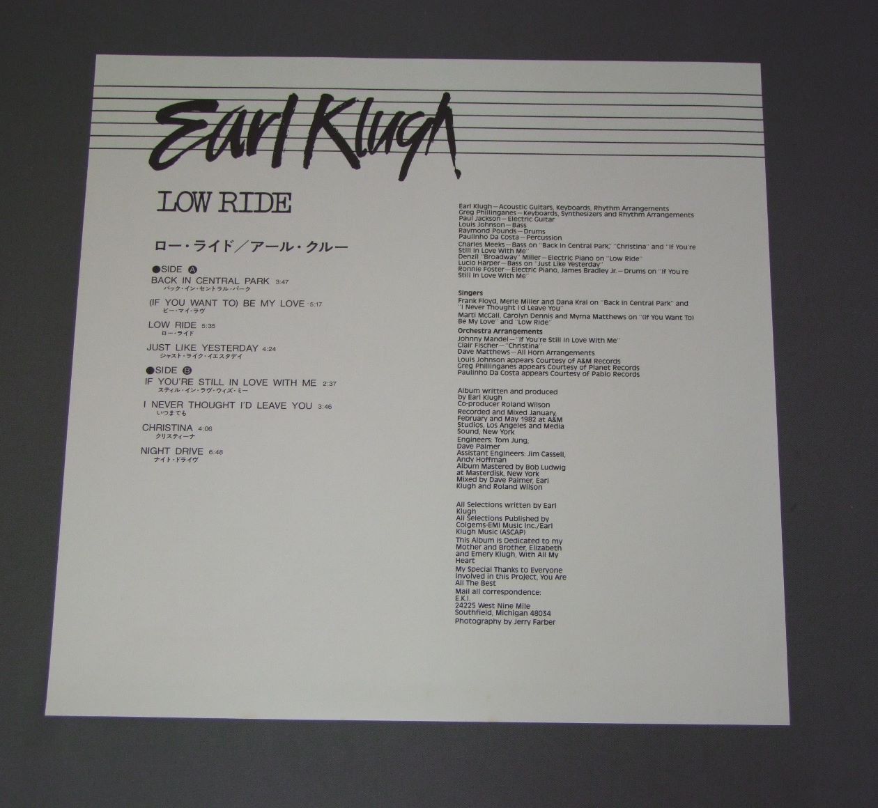 EARL KLUGHアール・クルー/LOW RIDEロー・ライド K28P6230 製造国:日本盤 / Media:LP外観:EX盤の状態:EX+帯:EX 価格(税込):¥1,100(売約済) 送料 7inch:定形外郵便 360円~LP:定形外郵便 660円~送料は、注文の最終画面で確認頂けます。 > > EARL KLUGH/LOW RIDE 外観 (EX)特記事項:特記なし。外観EXの共通説明:ダメージが限定的。中古品としては保存状態がよい方。シミ、ヨゴレ、スレ 少し~軽度。 盤の状態 (EX+)特記事項:極薄いスリキズ・スレ少し。一見してきれいな状態です。盤EX+の共通説明:盤面の極薄いスリキズ、スレ少し程度 音に出そうなものは無いように見える(極軽微なソフトティック音は除く)。 帯の状態 (EX):特記なし。 Tweet それぞれの画像をクリックすると、大きい写真が見られます こちらの商品もお勧めです 1,320円 RICHIE COLEリッチー・コール / ALIVE !アライヴ ! 1,210円 SONNY STITT WITH QUINCY JONES ORCHETRAソニー・スティット・クインシージョーンズ オーケストラ / SAME TITLE 1,210円 JIMMY SMITHジミー・スミス / PORTUGUESE SOULポルトガル・ソウル 1,210円 ERROLL GARNERエロール・ガーナー / SERENADE TO LAURAセレナード・トゥ・ローラ 1,210円 ESQUIRE ALL STARS etc / FLYIN` ON A V-DISC (V-DISC ALL STAR JAZZ SESSIONS VOL2)フライン・オン・ア・Vディスク (Vディスク・オールスターズ第2集) 1,320円 QUINCY JONESクィンシー・ジョーンズ / THIS IS HOW I FEEL ABOUT JAZZ私の考えるジャズ 770円 TERUMASA HINO日野皓正 / PYRAMIDピラミッド 1,320円 DOLLAR BRANDダラー・ブランド / AFRICAN PIANOアフリカン・ピアノ