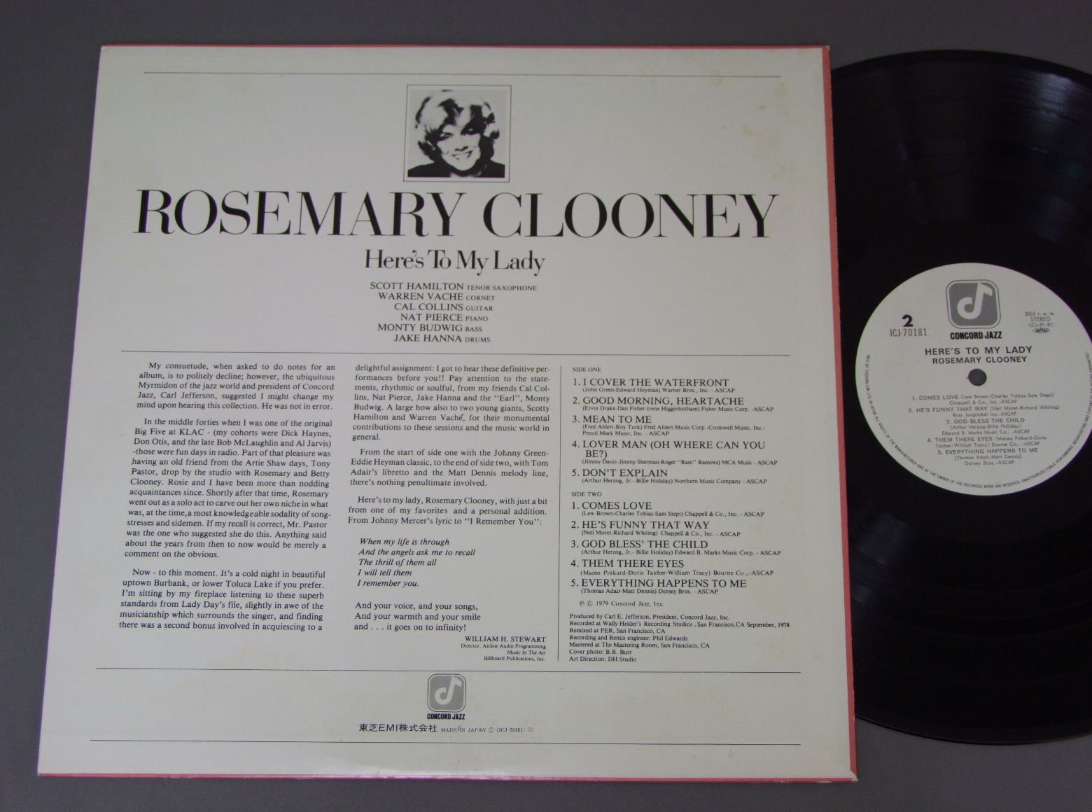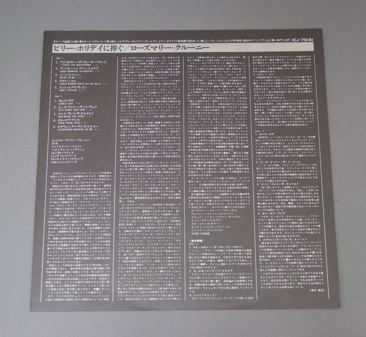 ROSEMARY CLOONEY/HERE`S TO MY LADYビリー・ホリディに捧ぐ ICJ70181 製造国:日本盤 / Media:LP外観:EX-盤の状態:EX 価格(税込):¥1,320(売約済) 送料 7inch:定形外郵便 360円~LP:定形外郵便 660円~送料は、注文の最終画面で確認頂けます。 > > ROSEMARY CLOONEY/HERE`S TO MY LADY 外観 (EX-)特記事項:底スレ多少有り。裏ジャケにシミ多少有り。外観EX-の共通説明:ダメージ軽度~多少。 中古品としては普通の状態。シミ、ヨゴレ、スレなど軽く~多少。 盤の状態 (EX)特記事項:薄いスリキズ・スレ軽くある感じ。軽微なものの様子です。盤EXの共通説明:盤面のスリキズが薄いものが少し~軽度 音に出そうなものは無いように見える(軽微なソフトティック音は除く)。 Tweet それぞれの画像をクリックすると、大きい写真が見られます こちらの商品もお勧めです 990円 PETER SPRAGUEピーター・スプラッチ / MUSICA DEL MARムジカ・デル・マール 1,320円 CHARLIE MINGUSチャーリー・ミンガス / PITHECANTHROPUS ERECTUS直立猿人 662円 FRANCOIS GLORIEUXグロリュー / PLAYS THE BEATLESビートルズを弾く 880円 HERBIE MANNハービー・マン / EVOLUTION OF MANNハービー・マン・ストーリー 1,210円 BUCK CLAYTON SEPTETバック・クレイトン / BUCKIN` THE BLUESバッキン・ザ・ブルース 1,210円 EDDIE CONDON & OTHERSエディ・コンドン・アンド・アザーズ / CHICAGO&ALL THAT JAZZ!シカゴ・アンド・オール・ザット・ジャズ! 1,210円 WOODY HERMANウディ・ハーマン / SECOND HERDセカンド・ハード 990円 CHARLIE PARKERチャーリー・パーカー / CHARLIE PARKER ON SAVOY VOL4チャーリー・パーカー・オン・サヴォイVOL4