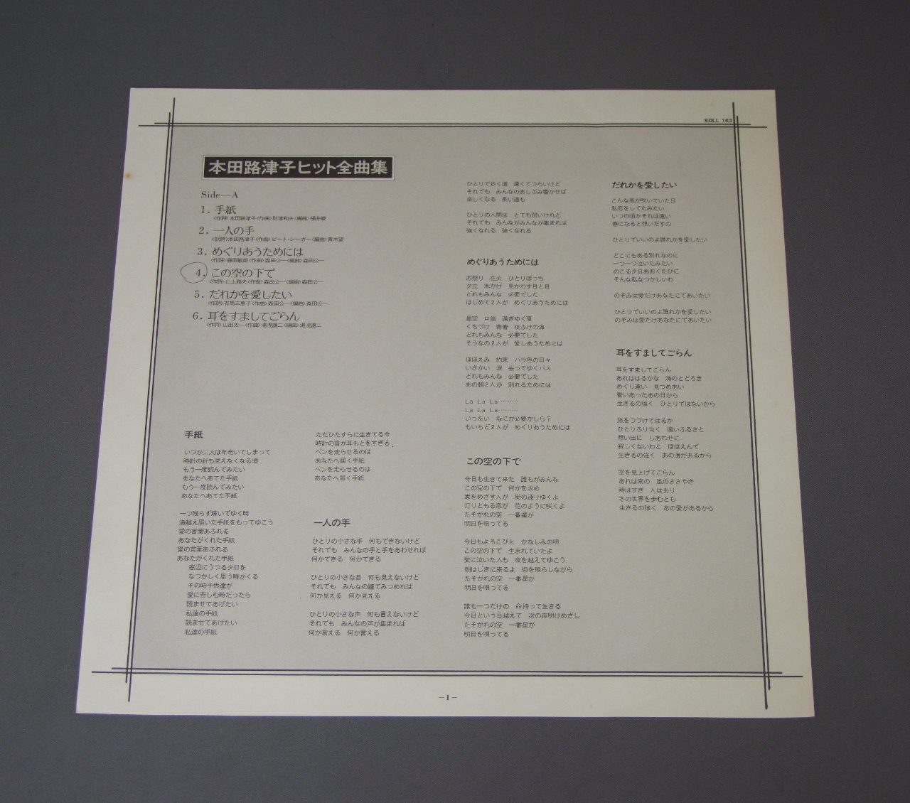 本田路津子/BEST HITS SOLL163 製造国:日本盤 / Media:LP外観:EX盤の状態:EX+ 価格(税込):¥1,047(売約済) 送料 7inch:定形外郵便 360円~LP:定形外郵便 660円~送料は、注文の最終画面で確認頂けます。 > > /BEST HITS 外観 (EX)特記事項:特記なし。外観EXの共通説明:ダメージが限定的。中古品としては保存状態がよい方。シミ、ヨゴレ、スレ 少し~軽度。 盤の状態 (EX+)特記事項:極薄いスリキズ・スレ少し。一見してきれいな状態です。盤EX+の共通説明:盤面の極薄いスリキズ、スレ少し程度 音に出そうなものは無いように見える(極軽微なソフトティック音は除く)。 Tweet それぞれの画像をクリックすると、大きい写真が見られます こちらの商品もお勧めです 1,210円 YOSHIKI TAKAOKA高岡良樹 / WORLD OF YOSHIKI TAKAOKA AUTOGRAPHEDうたもの語り 高岡良樹の世界 サイン付 770円 NATARSHER SEVENナターシャー・セブン / GOOD LOOKIN`道 世界のうた編 2,750円 JACKSジャックス / LEGEND 770円 SHIGEMI YOSHIOKA吉岡しげ美 / MUSIC POEM ONNA NO UTA 吉岡しげ美音楽詩集 女の詩そして現在 1,980円 JIRO`Sジローズ / BRAND NEW SONGS JORO`S 2新しい唄 ジローズ 2 2,200円 TAKUROU YOSHIDA吉田拓郎 / ON STAGEオン・ステージ 1,980円 FURIDO古井戸 / POESYぽえじー(3rd ALBUM) 770円 TAKASHI NISHIOKA西岡たかし / SOUPスープ