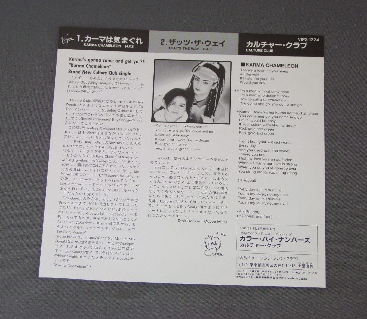 CULETURE CLUBカルチャー・クラブ/KARMA CHAMELEONカーマは気まぐれ VIPX1724 製造国:日本盤 / Media:7inch外観:EX+盤の状態:EX+ 価格(税込):¥440(売約済) 送料 7inch:定形外郵便 360円~LP:定形外郵便 660円~送料は、注文の最終画面で確認頂けます。 > > CULETURE CLUB/KARMA CHAMELEON 外観 (EX+)特記事項:特記なし。コンディションリストを山椒下さい。外観EX+の共通説明:中古としては美品、一見してきれいでダメージが軽微。シミ、ヨゴレ、スレ有っても僅か~少し。 盤の状態 (EX+)特記事項:極薄いスリキズ・スレ少し。一見してきれいな状態です。盤EX+の共通説明:盤面の極薄いスリキズ、スレ少し程度 音に出そうなものは無いように見える(極軽微なソフトティック音は除く)。 Tweet それぞれの画像をクリックすると、大きい写真が見られます こちらの商品もお勧めです 440円 SCREAMING BLUE MESSIAHSスクリーミング・ブルー・メサイアズ / BIKINI REDビキニ・レッド 1,320円 CLASSIX NOUVEAUXクラシックス・ヌヴォー / NIGHT PEOPLE夜行人間 770円 TAZMANIAN DEVILSタズマニアン・デヴィルズ / アメリカン・ドリームを探して 1,320円 NENAネーナ / NENAロックバルーンは99 1,320円 QUARTERFLASHクウォーターフラッシュ / QUARTERFLASHミッドナイト・フラッシュ 440円 BELLE STARSベル・スターズ / BELLE STARSベル・スターズ 550円 HUNG CHUNGワン・チャン / HUNG CHUNGダンス・ホール・デイズ 550円 CORBIN HANNER BANDコーバン・ハナー・バンド / SON OF AMERICAサン・オブ・アメリカ