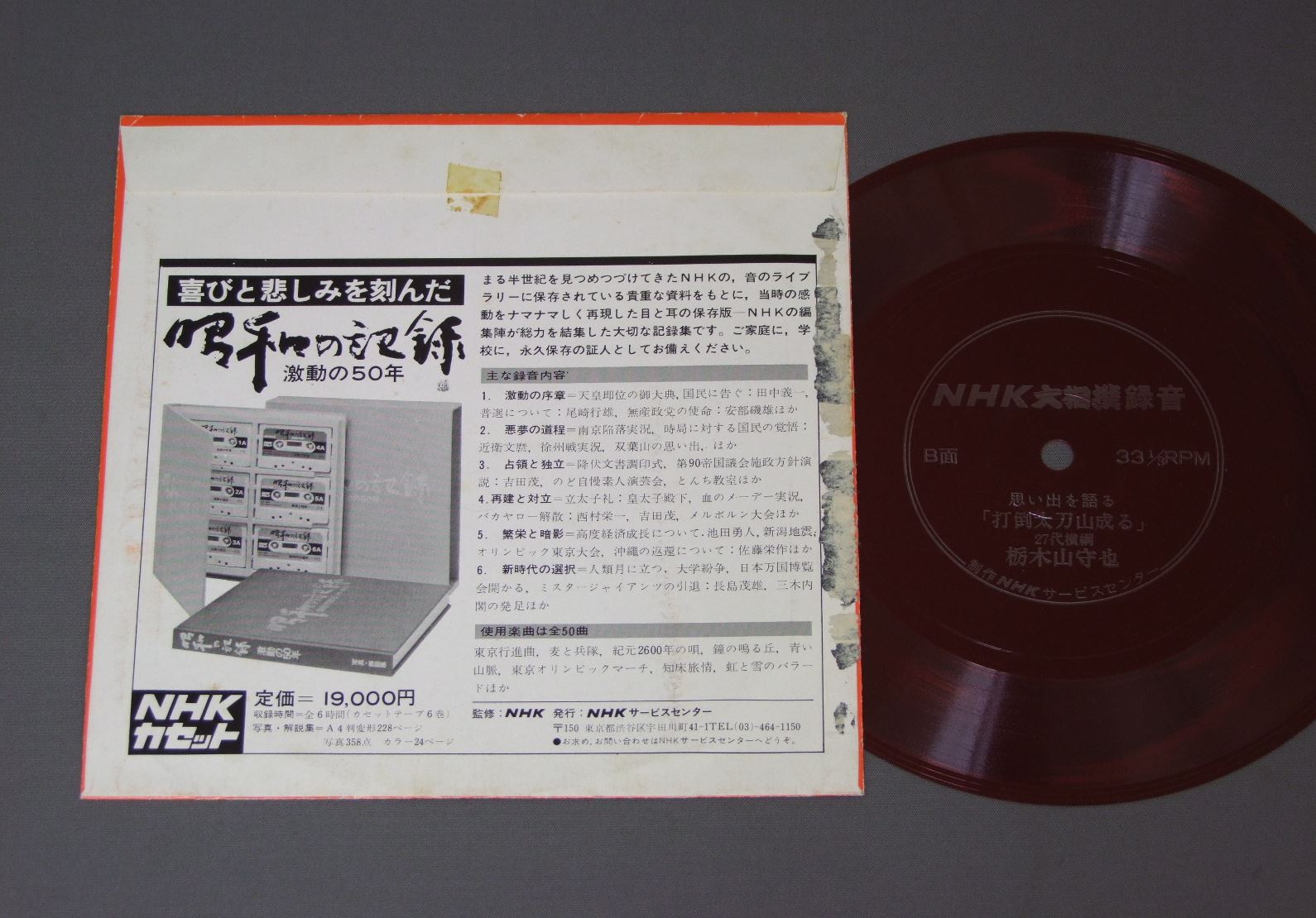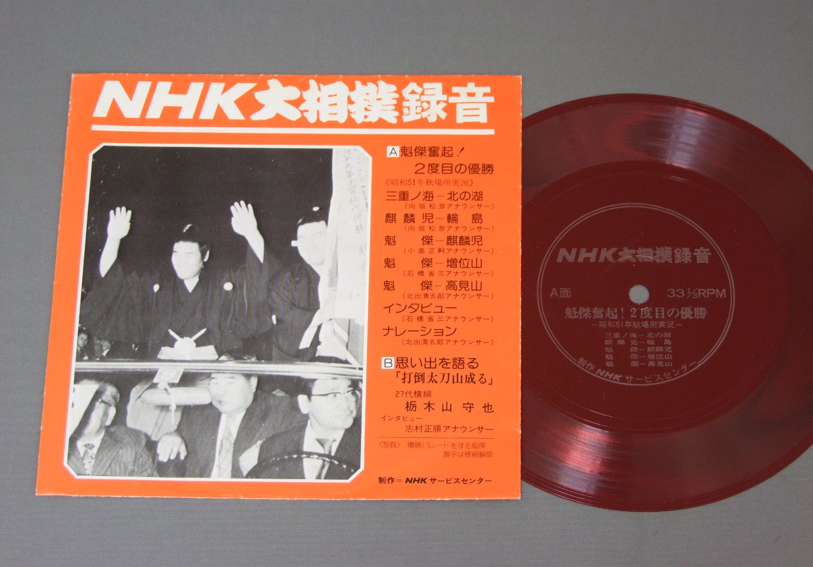 NHK大相撲録音/魁傑奮起!2度目の優勝 ソノシート ★ 製造国:日本盤 / Media:7inch外観:EX-盤の状態:EX+ 価格(税込):¥524(売約済) 送料 7inch:定形外郵便 360円~LP:定形外郵便 660円~送料は、注文の最終画面で確認頂けます。 > > / 外観 (EX-)特記事項:ヘリスレ多いです。外観EX-の共通説明:ダメージ軽度~多少。 中古品としては普通の状態。シミ、ヨゴレ、スレなど軽く~多少。 盤の状態 (EX+)特記事項:極薄いスリキズ・スレ少しだけ。一見してきれいな状態です。盤EX+の共通説明:盤面の極薄いスリキズ、スレ少し程度 音に出そうなものは無いように見える(極軽微なソフトティック音は除く)。 Tweet それぞれの画像をクリックすると、大きい写真が見られます こちらの商品もお勧めです 770円 SUMO SOUNDS呼出し三郎 他 / SUMO-JINKU相撲甚句 1,320円 PRO-WRESTLINGプロレスリング / STAR PRO-WRESTER THEME SONGS各スーパースターテーマ曲集 1,320円 PRO-WRESTLINGプロレスリング / PRO-WRESTLING 2プロレスリング 2 990円 甲子園 / 全国中等学校・高等学校野球大会史 770円 JAPANESE PRO-WRESTLINGプロレス / SUPER FIGHTER`S THEMESスーパー・ファイターのテーマ