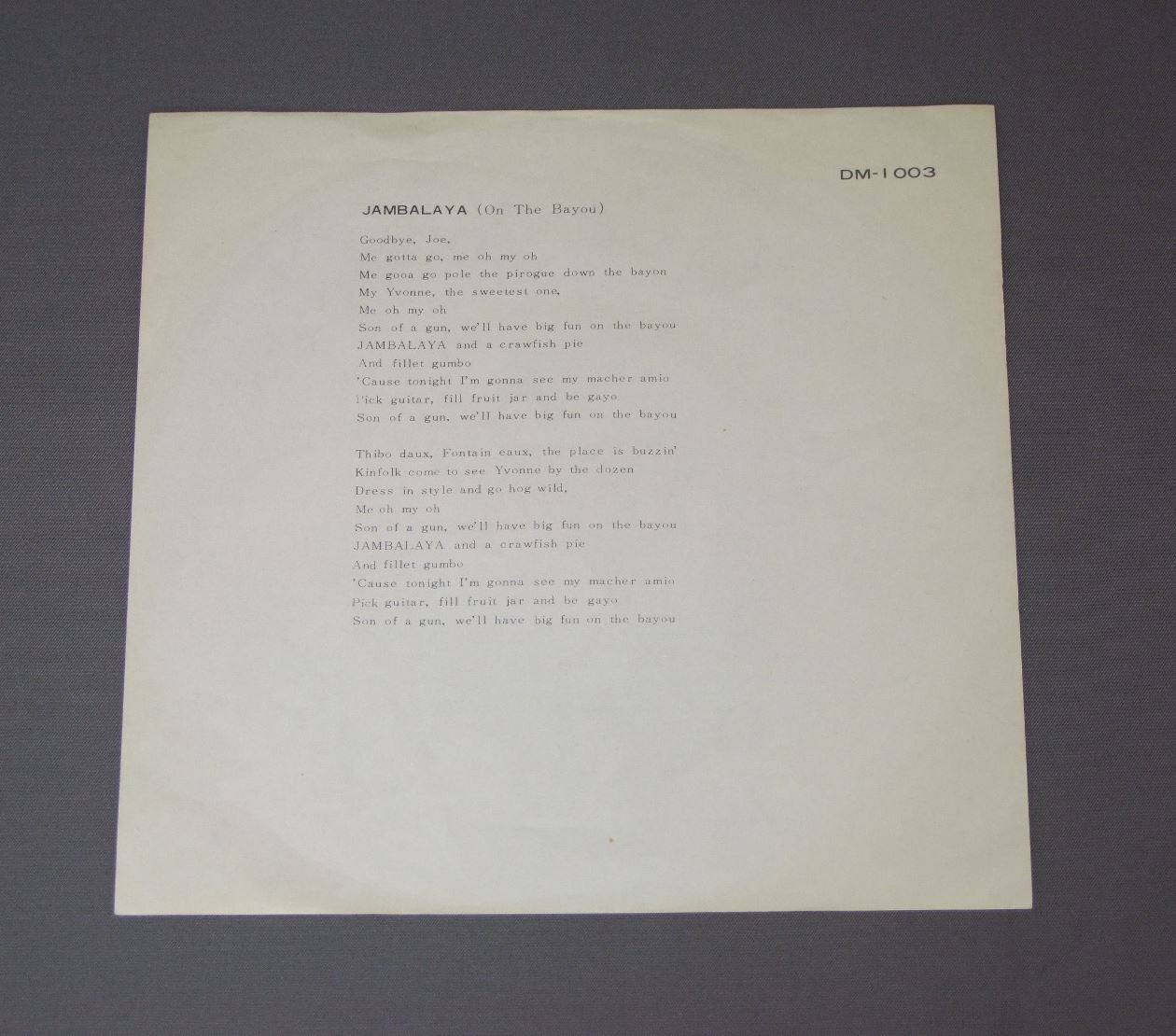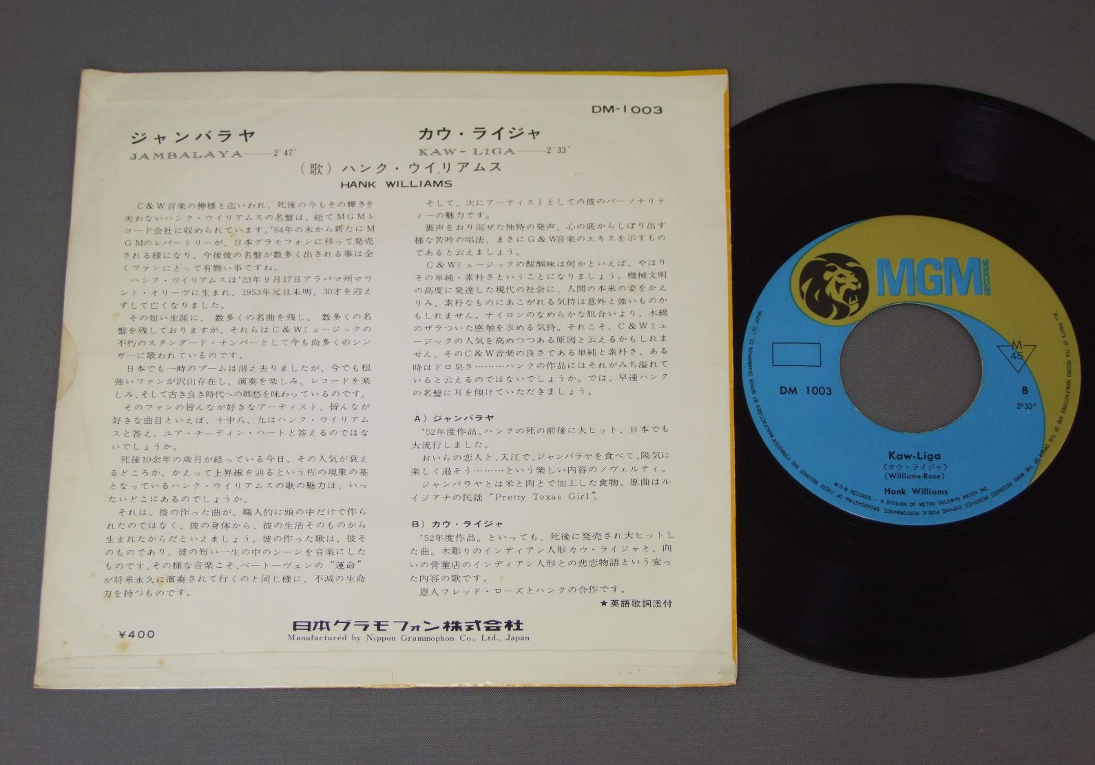 HANK WILLIAMSハンク・ウイリアムス/JAMBALAYAジャンバラヤ DM1003 製造国:日本盤 / Media:7inch外観:VG+盤の状態:EX- 価格(税込):¥524(売約済) 送料 7inch:定形外郵便 360円~LP:定形外郵便 660円~送料は、注文の最終画面で確認頂けます。 > > HANK WILLIAMS/JAMBALAYA 外観 (VG+)特記事項:背や上下ヘリスレ有り。上ヘリ付近は日焼け退色有り。裏ジャケにシミ。外観VG+の共通説明:ダメージやや有り。シミ、ヨゴレ、スレなど多少~やや多め。 盤の状態 (EX-)特記事項:薄いスリキズ・細かい表面スレ多少ある感じ。殆どが軽微なものの様子です。盤EX-の共通説明:盤面のスリキズが多少有り。音に出そうなものは殆ど無いように見える~さほど気にならないぐらいの軽いプチ数カ所程度。 Tweet それぞれの画像をクリックすると、大きい写真が見られます こちらの商品もお勧めです 770円 NITTY GRITTY DIRT BANDニッティー・グリッティー・ダート・バンド / UNCLE CHARLIE & HIS DOG TEDDYアンクル・チャーリーと愛犬テディー 770円 NITTY GRITTY DIRT BANDニッティー・グリッティー・ダート・バンド / STARS&STRIPES FOREVER星条旗よ永遠なれ! 990円 PETER PAUL & MARYピーター・ポール&マリー / IN CONCERT 770円 BROTHERS FOURブラザース・フォア / HONEY WIND BLOWSビッグ・フォーク・ヒッツ 第3集 990円 KITTY WELLSキティ・ウェルズ / DUST ON THE BIBLEダスト・オン・ザ・バイブル 660円 JOAN BAEZジョーン・バエズ / JOAN自由の女神 1,320円 JOAN BAEZジョーン・バエズ / GULF WINDSガルフ・ウィンズ 990円 BANJO BARONSバンジョー・バロンズ / IT`S A FOLK FOLK FOLK FOLK WORLDバンジョー. フォーク・ソングの世界 ペラジャケ