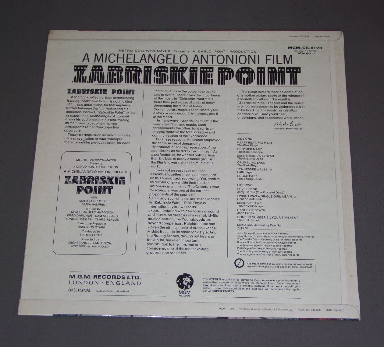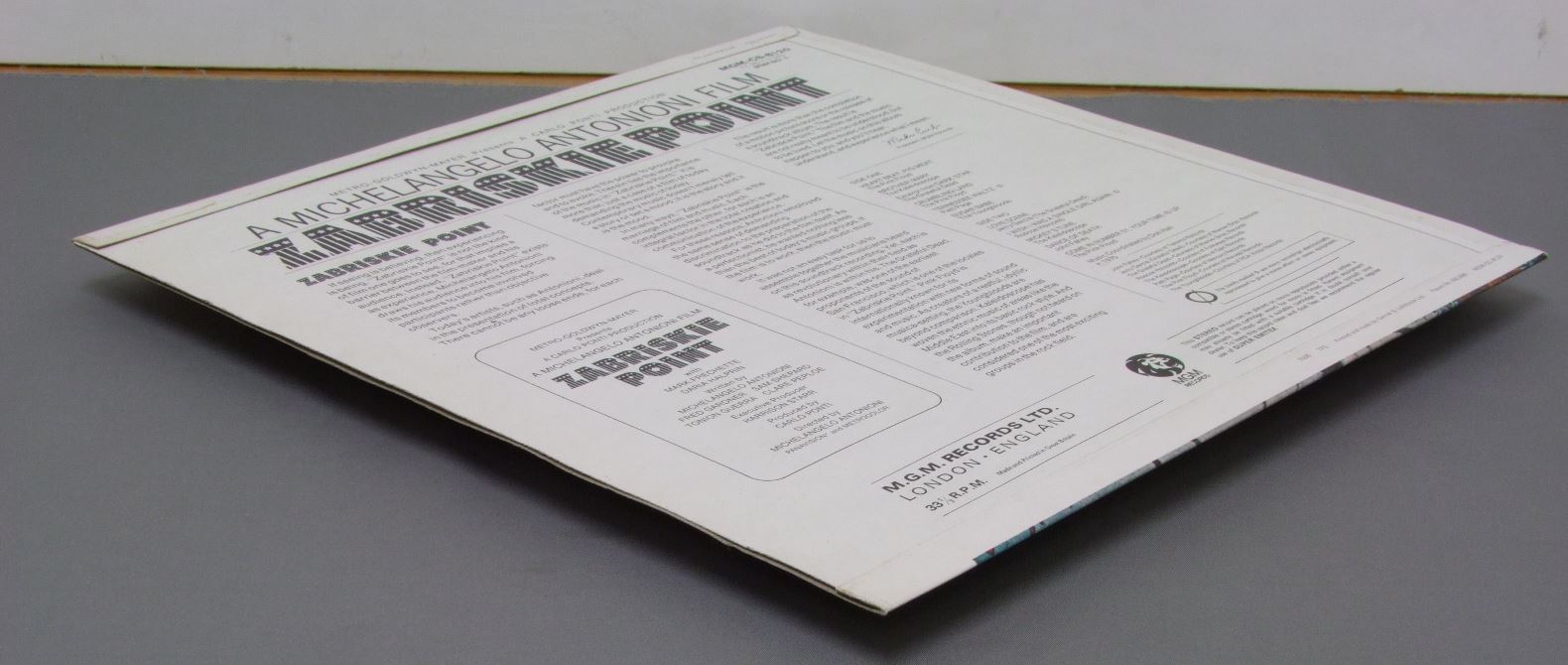 SOUNDTRACK ( PINK FLOYD KALEIDOSCOPE etc )/ZABRISKIE POINT MGM-CS-8120 製造国:英国盤 / Media:LPMatrix:A-1/1/0 | B-2/1/O外観:EX+盤の状態:EX+ 価格(税込):¥16,500(売約済) 送料 7inch:定形外郵便 360円~LP:定形外郵便 660円~送料は、注文の最終画面で確認頂けます。 > > SOUNDTRACK ( PINK FLOYD KALEIDOSCOPE etc )/ZABRISKIE POINT 外観 (EX+)特記事項:表ジャケは厚手のコーティング仕様。ジャケ表面は全体的にコーティングのヨレシワもあまり無く、スレやスリキズ等の少ない大変きれいな状態。裏ジャケもよごれは少ないです。外観EX+の共通説明:中古としては美品、一見してきれいでダメージが軽微。シミ、ヨゴレ、スレ有っても僅か~少し。 盤の状態 (EX+)特記事項:極薄いスリキズ・スレ少しある程度。音に出そうなものもなく一見してきれいな状態です。曲間など、静かなところを中心に聴いて見ましたが、チリノイズ少ないきれいな再生具合でした。盤EX+の共通説明:盤面の極薄いスリキズ、スレ少し程度 音に出そうなものは無いように見える(極軽微なソフトティック音は除く)。 Tweet それぞれの画像をクリックすると、大きい写真が見られます こちらの商品もお勧めです