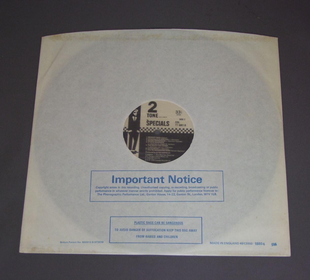 SPECIALS/1st ALBUM TT5001 製造国:英国盤 / Media:LPMatrix:A//1 | B//6外観:EX盤の状態:EX+ 価格(税込):¥4,950(売約済) 送料 7inch:定形外郵便 360円~LP:定形外郵便 660円~送料は、注文の最終画面で確認頂けます。 > > SPECIALS/1st ALBUM 外観 (EX)特記事項:表ジャケは厚手のコーティング仕様で全体的にコーティングのヨレシワは少ない状態。スレやスリキズ等も薄いものが中心。裏ジャケもよごれやスレ等は少ないと思います。外観EXの共通説明:ダメージが限定的。中古品としては保存状態がよい方。シミ、ヨゴレ、スレ 少し~軽度。 盤の状態 (EX+)特記事項:薄いスリキズ・スレ少しある程度。音に出そうなものもなく一見してきれいな状態です。曲間など、静かなところを中心に聴いて見ましたが、チリノイズ少ないきれいな再生具合でした。盤EX+の共通説明:盤面の極薄いスリキズ、スレ少し程度 音に出そうなものは無いように見える(極軽微なソフトティック音は除く)。 Tweet それぞれの画像をクリックすると、大きい写真が見られます こちらの商品もお勧めです 4,400円 ACCURSED / LAUGHING AT YOU 3,520円 STRANGLERS / AURAL SCULPTURE 6,600円 DAMNED / LIVE IN NEWCASTLE 2,640円 VARIOUS PUNK ARTISTS / YUP IN FLAMES 2,640円 VARIOUS CHISWICK ARTIST / CHISWICK CHARTBUSTERS VOL.2 ( LONG SHOTS DEAD CHRTS AND ODDS ON FAVOURITES ) 4,400円 STRAPS / STRAPS 3,520円 STRANGLERS / LIVE ( X CERT ) 3,300円 MOOD SIX / MATTER OFF