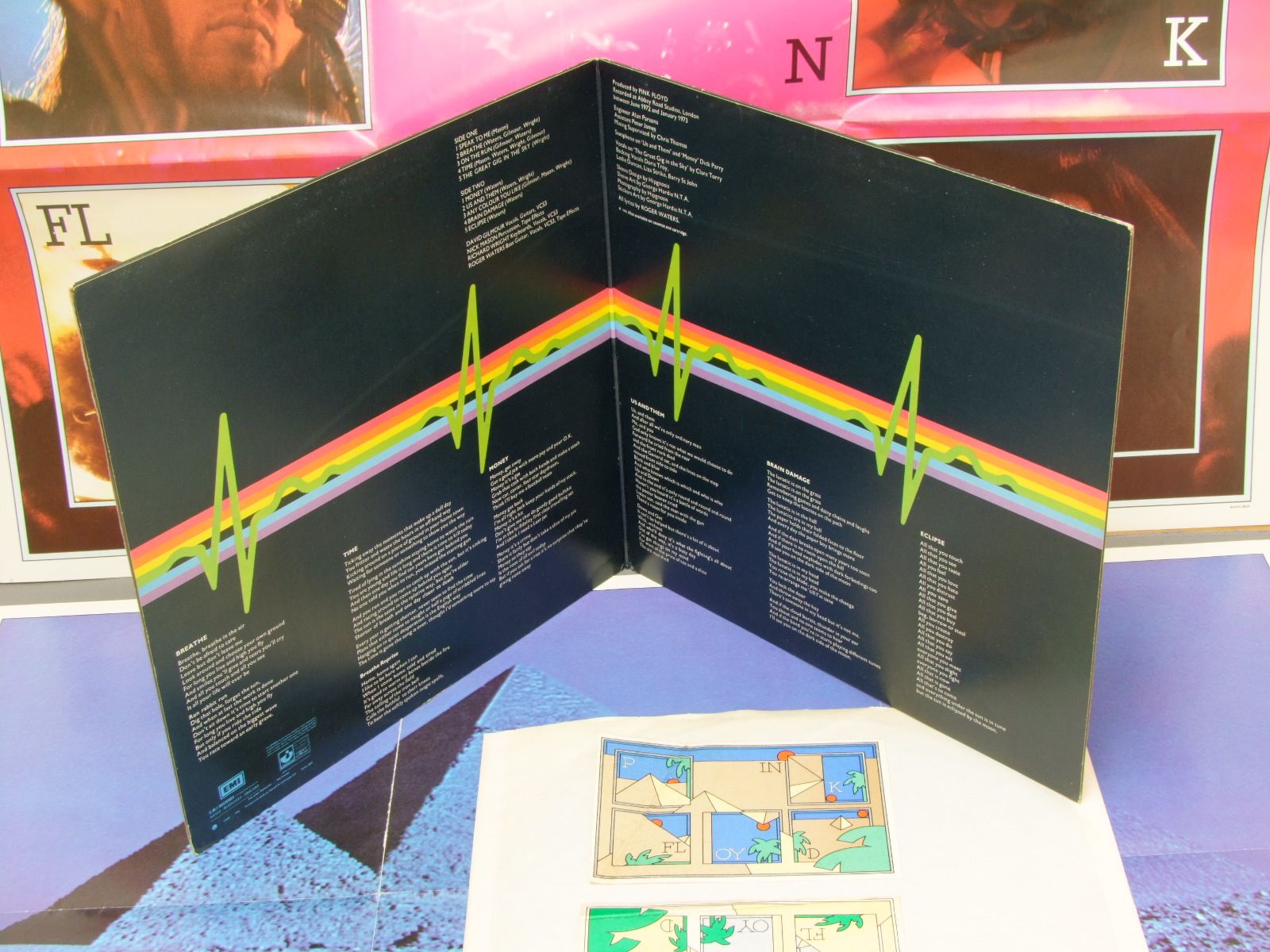 PINK FLOYD/DARK SIDE OF THE MOON 狂気 GRAMOPHONE盤 SHVL804 製造国:英国盤 / Media:LPMatrix:A-3/2か6か/RGR | B-3/1/GL外観:VG+盤の状態:EX- 価格(税込):¥13,200(売約済) 送料 7inch:定形外郵便 360円~LP:定形外郵便 660円~送料は、注文の最終画面で確認頂けます。 > > PINK FLOYD/DARK SIDE OF THE MOON 外観 (VG+)特記事項:やや青みのおびた黒ジャケ。初期タイプです。表ジャケの底スレ大。上ヘリもスレやや多めです。背スレも多少有り。表ジャケはスレやスリキズ、よごれ等は薄い感じ。裏ジャケはスレはがれ小や鈍いスリキズ等は多少有り。見開きもスレは薄い感じ。ステッカーは2枚とも折れ跡有り。初期のものです。ポスターは薄手のタイプ。ピンクの方はきれいな状態ですが、青の方は一部折り目に切れ有り。外観VG+の共通説明:ダメージやや有り。シミ、ヨゴレ、スレなど多少~やや多め。 盤の状態 (EX-)特記事項:薄いスリキズ・細かい表面スレ多少ある感じ。殆どが軽微なものの様子です。静かなところを中心に聞いてみてもチリプチは軽度。B2の最初の静かな所、少しプチありますが、チリプチ範囲内の薄い感じでした。音もとてもクリアーでオススメの再生具合でした。盤EX-の共通説明:盤面のスリキズが多少有り。音に出そうなものは殆ど無いように見える~さほど気にならないぐらいの軽いプチ数カ所程度。 Tweet それぞれの画像をクリックすると、大きい写真が見られます こちらの商品もお勧めです