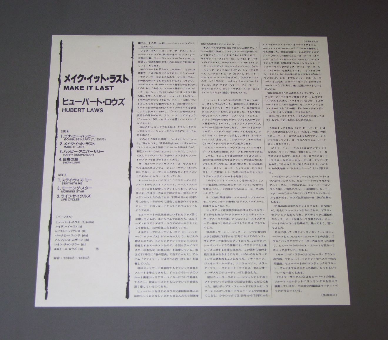 HUBERT LAWSヒューバート・ロウズ/MAKE IT LASTメイク・イット・ラスト 25AP2737 製造国:日本盤 / Media:LP外観:EX+盤の状態:EX+帯:EX+ 価格(税込):¥880(売約済) 送料 7inch:定形外郵便 360円~LP:定形外郵便 660円~送料は、注文の最終画面で確認頂けます。 > > HUBERT LAWS/MAKE IT LAST 外観 (EX+)特記事項:特記なし。外観EX+の共通説明:中古としては美品、一見してきれいでダメージが軽微。シミ、ヨゴレ、スレ有っても僅か~少し。 盤の状態 (EX+)特記事項:極薄いスリキズ・スレ少し。一見してきれいな状態です。盤EX+の共通説明:盤面の極薄いスリキズ、スレ少し程度 音に出そうなものは無いように見える(極軽微なソフトティック音は除く)。 帯の状態 (EX+):特記なし。 その他:見本盤 Tweet それぞれの画像をクリックすると、大きい写真が見られます こちらの商品もお勧めです 1,210円 DON GRUSINドン・グルーシン / DON GRUSINドン・グルーシン 770円 TAKESHI ITOH伊東たけし / DEAR HEARTS 660円 DEODATOデオダート / WHIRL WINDS旋風 770円 CHUCK MANGIONEチャック・マンジョーネ / FUN&GAMESファン・アンド・ゲームス 1,210円 ERNIE WATTSアーニー・ワッツ / CHARIOTS OF FIRE炎の走者 1,210円 CHICK COREAチック・コリア / PIANO INTEPRETATIONS VOL.2チック・コリア ソロ 第2集 440円 YUTAKA TOBE戸部豊 / TRUMPET 770円 YOSHIAKI MASUO増尾好秋 / SUNSHINE AVENUEサンシャイン・アヴェニュー