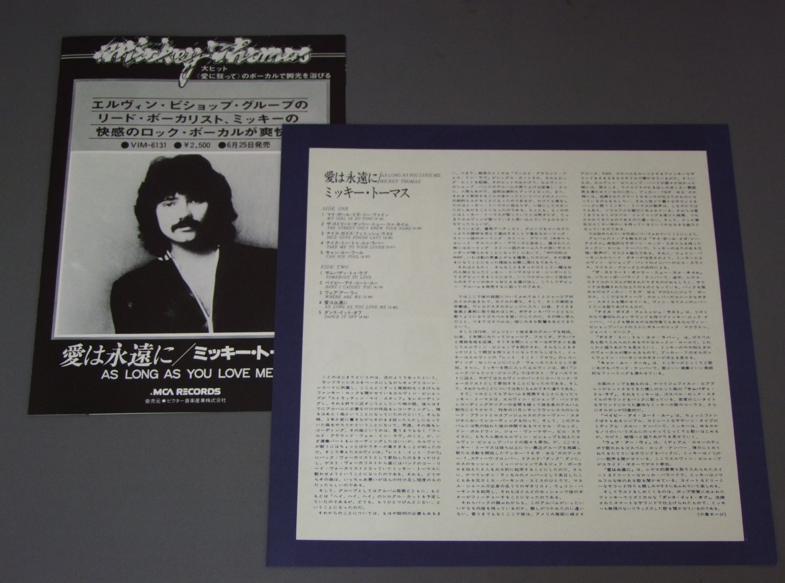 MICKEY THOMASミッキー・トーマス/AS LONG AS YOU LOVE ME愛は永遠に VIM6131 製造国:日本盤 / Media:LP外観:EX盤の状態:EX+ 価格(税込):¥1,047(売約済) 送料 7inch:定形外郵便 360円~LP:定形外郵便 660円~送料は、注文の最終画面で確認頂けます。 > > MICKEY THOMAS/AS LONG AS YOU LOVE ME 外観 (EX)特記事項:特記なし。外観EXの共通説明:ダメージが限定的。中古品としては保存状態がよい方。シミ、ヨゴレ、スレ 少し~軽度。 盤の状態 (EX+)特記事項:極薄いスリキズ・スレ少し。一見してきれいな状態です。盤EX+の共通説明:盤面の極薄いスリキズ、スレ少し程度 音に出そうなものは無いように見える(極軽微なソフトティック音は除く)。 その他:白見本盤 Tweet それぞれの画像をクリックすると、大きい写真が見られます こちらの商品もお勧めです 770円 YVES MONTANDイヴ・モンタン / LE PARIS DE… YVES MONTANDモンタン. パリの心を歌う 770円 FRED BONGUSTOフレッド・ボングスト / IL GIORNO E LA NOTTE昼と夜 1,320円 NEIL DIAMONDニール・ダイアモンド / HOT AUGUST NIGTグリーク・シアター・コンサート 440円 JOHNNY MATHISジョニー・マティス / KILLING ME SOFTLY WITH HER SONGやさしく歌って 880円 ROBERT PALMERロバート・パーマー / PRIDEプライド 770円 KEITH CARRADINEキース・キャラディン / I`M EASY-KEITH CARRADINEアイム・イージー-キース・キャラディン登場 660円 AL STEWARTアル・スチュアート / TIME PASSAGESタイム・パッセージ 770円 TOM ROBINSONトム・ロビンソン / STILL LOVING YOUスティル・ラヴィング・ユー