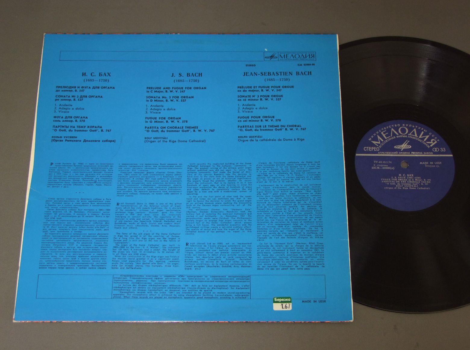 ROLF UUSVYALI/BACH PRELUDES AND FUGUES FOR ORGAN CM03989 90 製造国:輸入盤 / Media:LP外観:EX+盤の状態:EX- 価格(税込):¥660(売約済) 送料 7inch:定形外郵便 360円~LP:定形外郵便 660円~送料は、注文の最終画面で確認頂けます。 > > ROLF UUSVYALI/BACH PRELUDES AND FUGUES FOR ORGAN 外観 (EX+)特記事項:特記なし。外観EX+の共通説明:中古としては美品、一見してきれいでダメージが軽微。シミ、ヨゴレ、スレ有っても僅か~少し。 盤の状態 (EX-)特記事項:薄いスリキズ・細かい表面スレ軽くある感じ。全体的には殆どが軽微なものの様子です。盤EX-の共通説明:盤面のスリキズが多少有り。音に出そうなものは殆ど無いように見える~さほど気にならないぐらいの軽いプチ数カ所程度。 その他:ロシア盤 Tweet それぞれの画像をクリックすると、大きい写真が見られます こちらの商品もお勧めです 990円 WALTER AND BEATRICE KLIEN / MUSIC FOR PIANO FOUR HANDS 1,870円 HASKIL / HASKIL VOLUME2 1,430円 WALCHA - / RESEARCH PERIOD SERIES 2,200円 BENNO MIOISEIWITSCH / BENNO MIOISEIWITSCH 770円 MATTIWILDA DOBBS & GERALD MOORE / MATTIWILDA DOBBS & GERALD MOORE 990円 GRAINNE YEATSグラーニア・イェイツ / BELFAST HARP FESTIVAL 1792 990円 EUGENE D`ALBERT / EUGENE D`ALBERT COMPOSER AND PIANIST VOLUME 2 880円 RUDOLF KEMPE / FERDINAND FRANTZ AS HANS SACHS IN MEISTERSINGER
