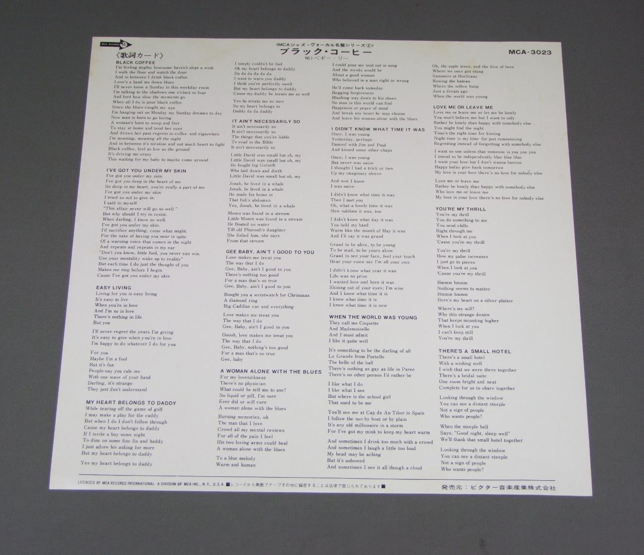 PEGGY LEEペギー・リー/BLACK COFFEEブラック・コーヒー MCA3023 製造国:日本盤 / Media:LP外観:VG+盤の状態:EX帯:EX- 価格(税込):¥1,362(売約済) 送料 7inch:定形外郵便 360円~LP:定形外郵便 660円~送料は、注文の最終画面で確認頂けます。 > > PEGGY LEE/BLACK COFFEE 外観 (VG+)特記事項:裏ジャケにシミ。外観VG+の共通説明:ダメージやや有り。シミ、ヨゴレ、スレなど多少~やや多め。 盤の状態 (EX)特記事項:薄いスリキズ・スレ軽くある感じ。軽微なものの様子です。盤EXの共通説明:盤面のスリキズが薄いものが少し~軽度 音に出そうなものは無いように見える(軽微なソフトティック音は除く)。 帯の状態 (EX-):裏側にシミ少々 Tweet それぞれの画像をクリックすると、大きい写真が見られます こちらの商品もお勧めです 770円 SINGERS UNLIMITEDシンガーズ・アンリミテッド / CAPELLAア・カペラ 1,320円 SUNSET ALL STARSサンセット・オール・スターズ / JAMMIN` AT SUNSET VOL.2ジャミン・アット・サンセット 第2集 770円 ART TATUM&HIS BANDアート・テイタム楽団 / ART TATUM & HIS SWINGSTERSアート・テイタム・オール・スター・セッション 990円 JAMES NEWTONジェームズ・ニュートン / DAYDREAMデイドリーム 880円 V-DISC ALL-STAR JAM SESSIONSVディスク・オールスター・ジャムセッション / V-DISC ALL-STAR JAM SESSIONSVディスク・オールスター・ジャムセッション VOL.5 440円 SADAO WATANABE渡辺貞夫 / MORNING ISLANDモーニング・アイランド 1,320円 HERBIE MANNハービー・マン楽団 / ST.THOMAS 60s ISSUEセント・トーマス ペラジャケ 770円 NORIO MAEDA前田憲男 / FEELINGSフィーリング