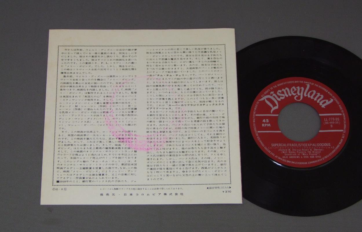 JULIE ANDREWSジュリー・アンドリュース/CHIM.CHIM.CHEREE ORIGINAL SOUNDTRACK OF「MARY POPPINS映画「メリー・ポピンズ」サウンドトラック「チム・チム・チェリー」 LL779DS 製造国:日本盤 / Media:7inch外観:EX盤の状態:EX+ 価格(税込):¥440(売約済) 送料 7inch:定形外郵便 360円~LP:定形外郵便 660円~送料は、注文の最終画面で確認頂けます。 > > JULIE ANDREWS/CHIM.CHIM.CHEREE ORIGINAL SOUNDTRACK OF「MARY POPPINS 外観 (EX)特記事項:特記なし。外観EXの共通説明:ダメージが限定的。中古品としては保存状態がよい方。シミ、ヨゴレ、スレ 少し~軽度。 盤の状態 (EX+)特記事項:薄いスリキズ・スレ少し。一見してきれいな状態です。盤EX+の共通説明:盤面の極薄いスリキズ、スレ少し程度 音に出そうなものは無いように見える(極軽微なソフトティック音は除く)。 その他:※画像では確認できない、上下ヘリ、背表紙、取り出し口を中心に状態表記しております。画像で確認出来る表裏ジャケ、レーベルの状態表記は省いている場合がありますので、そちらの状態は画像でご確認をお願い致します。携帯の方は一度PC等で写真をご確認の上ご入札下さいますよう、お願い申し上げます。 Tweet それぞれの画像をクリックすると、大きい写真が見られます こちらの商品もお勧めです 1,320円 MORTON GOULDモートン・グールド / SOUND TRACK HOLOCAUST映画ホロコースト 990円 ORIGINAL SOUND TRACKオリジナル・サウンド・トラック / CHITTY CHITTY BANG BANGチキ・チキ・バン・バン 1,650円 MOMOE YAMAGUCHI & TOMOKAZU MIURA山口百恵と三浦友和 / WHITE LOVEホワイト・ラブ 1,980円 HIROSHI AKUTAGAWA - TOKYO SYMPHONY ORCHESTRA芥川比呂志 - 東京交響楽団 / SOUNDTRACK SUNA-NO UTSUWA松竹映画 砂の器 1,320円 無声映画鑑賞会 / おお活動大写真 550円 YUJIRO ISHIHARA石原裕次郎 / SOUND TRACK FROM NIKKATSU FILM想い出のスクリーン(日活映画サウンドトラックより) 1,210円 JOHN BARRYジョン・バリー / 10th ANNIVERSARY JAMES BOND ALBUM映画007 スーパー・パック 1,650円 FRANCIS COPPOLAフランシス・コッポラ / SOUNDTRACK APOCALYPSE NOWサントラ 地獄の黙示録