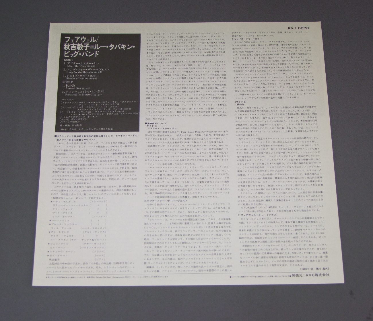 TOSHIKO AKIYOSHI=LEW TABACKIN BIG BAND秋吉敏子=ルー・タバキン・ビッグ・バンド/FAREWELLフェアウェル RVJ6078 製造国:日本盤 / Media:LP外観:EX-盤の状態:EX+ 価格(税込):¥990(売約済) 送料 7inch:定形外郵便 360円~LP:定形外郵便 660円~送料は、注文の最終画面で確認頂けます。 > > TOSHIKO AKIYOSHI=LEW TABACKIN BIG BAND/FAREWELL 外観 (EX-)特記事項:表ジャケ背付近にペンキ、裏ジャケ背下辺りに付着物。外観EX-の共通説明:ダメージ軽度~多少。 中古品としては普通の状態。シミ、ヨゴレ、スレなど軽く~多少。 盤の状態 (EX+)特記事項:極薄いスリキズ・スレ少し。一見してきれいな状態です。盤EX+の共通説明:盤面の極薄いスリキズ、スレ少し程度 音に出そうなものは無いように見える(極軽微なソフトティック音は除く)。 Tweet それぞれの画像をクリックすると、大きい写真が見られます こちらの商品もお勧めです 1,650円 MASABUMI KIKUCHI + GIL EVANS菊池雅章 / SAME TITLEWITH ギル・エヴァンス 990円 ISAO SASAKIイサオ・ササキ / AUTUMN SERENADEオータム・セレナーデ 1,320円 McCOY TYNERマッコイ・タイナー / ECHOES OF A FRIENDエコーズ・オブ・ア・フレンド 770円 LAMBERT-HENDRICKS & ROSS / SING ALONG WITH BASIEシング・アロング・ウィズ・べイシー 770円 RON CARTERロン・カーター / ANYTHING GOESエニシング・ゴーズ 770円 LIONEL HAMPTONライオネル・ハンプトン楽団 / LIONEL HAMPTON ON TOURニュー・コンサート 1,210円 MODERN JAZZ QUARTETMJQ / ART OF THE MODERN JAZZ QUARTETアート・オブ・MJQ 1,650円 NORIO MAEDA前田憲男 / SOUND IN VICTRONSOUND IN VICTRON