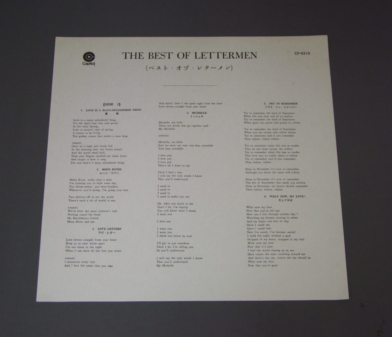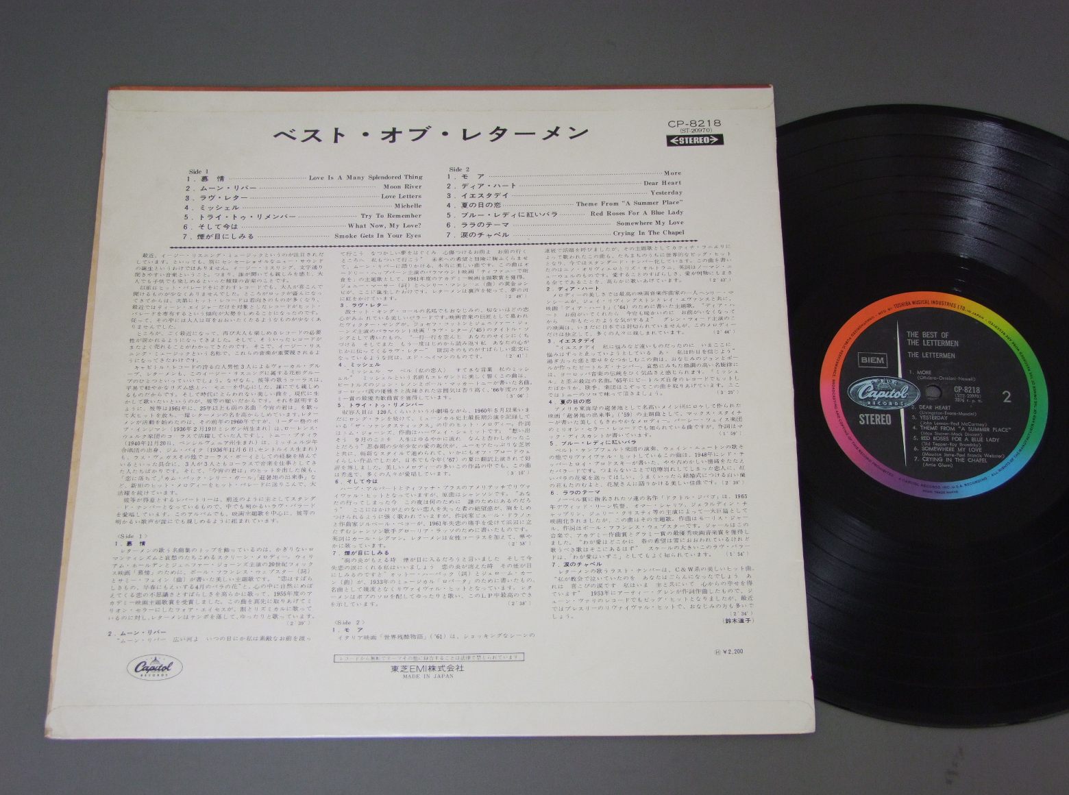 LETTERMEN/BEST OF THE LETTERMENペラジャケ CP8218 製造国:日本盤 / Media:LP外観:EX盤の状態:EX+ 価格(税込):¥990(売約済) 送料 7inch:定形外郵便 360円~LP:定形外郵便 660円~送料は、注文の最終画面で確認頂けます。 > > LETTERMEN/BEST OF THE LETTERMEN 外観 (EX)特記事項:特記なし。外観EXの共通説明:ダメージが限定的。中古品としては保存状態がよい方。シミ、ヨゴレ、スレ 少し~軽度。 盤の状態 (EX+)特記事項:薄いスリキズ・スレ少し。一見してきれいな状態です。盤EX+の共通説明:盤面の極薄いスリキズ、スレ少し程度 音に出そうなものは無いように見える(極軽微なソフトティック音は除く)。 その他:※画像では確認できない、上下ヘリ、背表紙、取り出し口を中心に状態表記しております。画像で確認出来る表裏ジャケ、レーベルの状態表記は省いている場合がありますので、そちらの状態は画像でご確認をお願い致します。携帯の方は一度PC等で写真をご確認の上ご入札下さいますよう、お願い申し上げます。 Tweet それぞれの画像をクリックすると、大きい写真が見られます こちらの商品もお勧めです 1,320円 ELVIS PRESLEY / THAT`S THE WAY IT ISこの胸のときめきを 440円 VENTURESベンチャーズ / POPS IN JAPANポップス・イン・ジャパン 990円 RICK NELSONリック・ネルソン / ALBUM SEVEN BY RICKアルバム・セブン・バイ・リック 880円 ELVISエルヴィス・プレスリー / THAT`S THE WAY IT ISこの胸のときめきを/映画「エルヴィス・オン・ステージ」主題歌集 990円 ELVISエルヴィス / THIS IS ELVIS-SELECTIONS FROM THE ORIGINAL MOTION PICUTRE SOUNDTRACK映画 THIS IS ELVIS オリジナル・サウンドトラック 1,210円 ELVIS PRESLEY / ELVIS IN PERSONプレスリー・イン・パーソン 770円 WANDA JACKSONワンダ・ジャクスン / WANDA JACKSON COUNTRY !ワンダ・ジャクスン・カントリー 880円 VENTURESベンチャーズ / JOYジョイ -ディスカバー・クラシック-