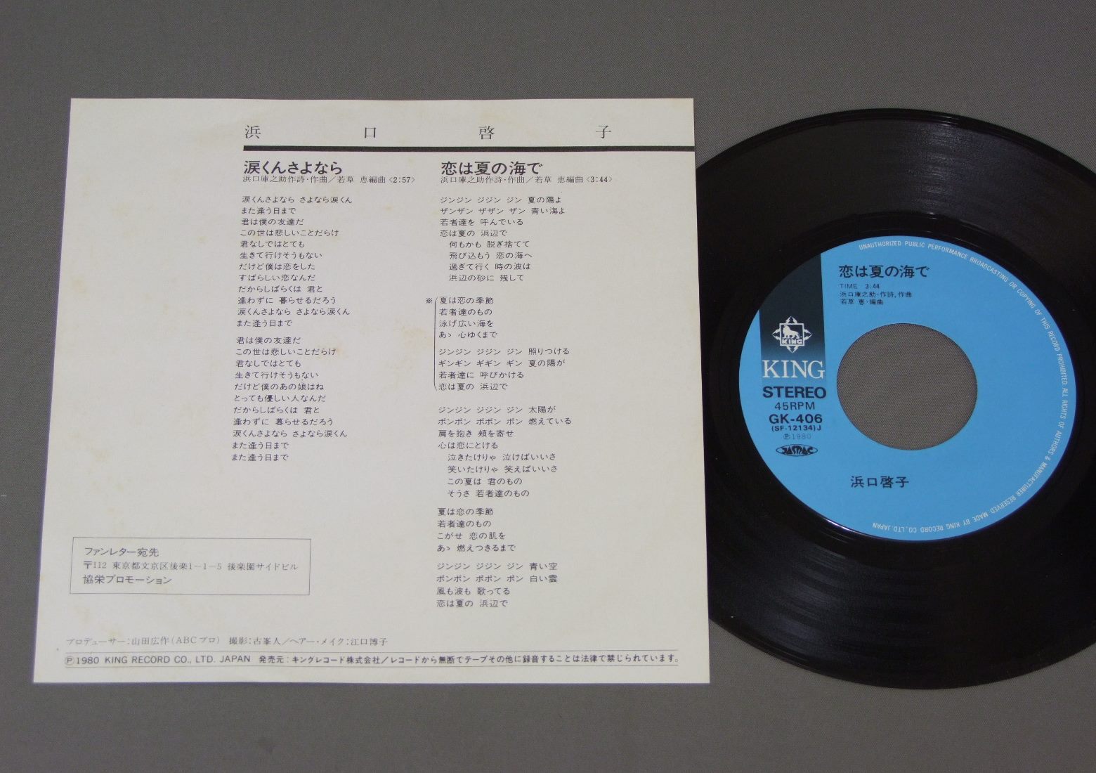 KEIKO HAMAGUCHI浜口啓子/ 涙くんさよなら GK406 製造国:日本盤 / Media:7inch外観:EX-盤の状態:EX+ 価格(税込):¥524(売約済) 送料 7inch:定形外郵便 360円~LP:定形外郵便 660円~送料は、注文の最終画面で確認頂けます。 > > KEIKO HAMAGUCHI/ 外観 (EX-)特記事項:裏側にシミ。右下にホッチキス穴。外観EX-の共通説明:ダメージ軽度~多少。 中古品としては普通の状態。シミ、ヨゴレ、スレなど軽く~多少。 盤の状態 (EX+)特記事項:極薄いスリキズ・スレ少し。一見してきれいな状態です。盤EX+の共通説明:盤面の極薄いスリキズ、スレ少し程度 音に出そうなものは無いように見える(極軽微なソフトティック音は除く)。 Tweet それぞれの画像をクリックすると、大きい写真が見られます こちらの商品もお勧めです 1,650円 MASABUMI KUROSAKA黒坂正文 / MO DO MESSAGE (AUTOGRAPHED)茂道 メッセージ (サイン付) 880円 CHAGE & ASUKAチャゲ&飛鳥 / LIVE IN TOKYO 81LIVE IN 田園コロシアム THE 夏祭り `81 550円 MASAHIRO KUWANA & TEAR DROPS桑名正博 & TEAR FROPS / COMMUNICATIONコミュニケーション 2,750円 STAGE 101ステージ101 / AKAI YANE NO IE赤い屋根の家 660円 MASAMICHI SUGI杉真理 / SYMPHONY #10シンフォニー10 662円 KATSUO OHNO大野克夫 / WINDWARD HILLウィンドワード・ヒル 1,320円 RUMIKO KOYANAGI小柳ルミ子 / HARU NO OTOZURE春のおとずれ 880円 TULIPチューリップ / LOVE MAP SHOPラヴ・マップ・ショップ