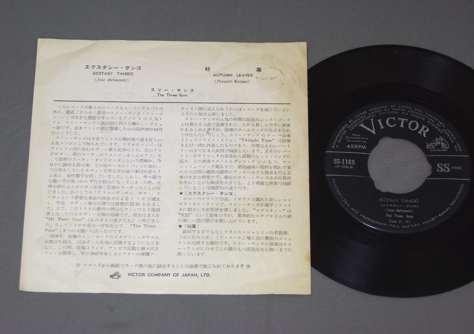 THREE SUNSスリー・サンズ/EZSTASY TANGOエクスタシー・タンゴ SS1165 製造国:日本盤 / Media:7inch外観:EX-盤の状態:EX 価格(税込):¥550(売約済) 送料 7inch:定形外郵便 360円~LP:定形外郵便 660円~送料は、注文の最終画面で確認頂けます。 > > THREE SUNS/EZSTASY TANGO 外観 (EX-)特記事項:上ヘリに短い切れ。右下のホッチキス穴。外観EX-の共通説明:ダメージ軽度~多少。 中古品としては普通の状態。シミ、ヨゴレ、スレなど軽く~多少。 盤の状態 (EX)特記事項:薄いスリキズ・スレ軽くある感じ。殆どが軽微なものの様子です。盤EXの共通説明:盤面のスリキズが薄いものが少し~軽度 音に出そうなものは無いように見える(軽微なソフトティック音は除く)。 Tweet それぞれの画像をクリックすると、大きい写真が見られます こちらの商品もお勧めです 990円 VENTURESベンチャーズ / ROOK`N`ROLL GRAFFITIロックン・ロール・グラフィティ 1,320円 VENTURESベンチャーズ / VENTURES A GO GOベンチャーズ・ア・ゴー・ゴー 770円 WANDA JACKSONワンダ・ジャクスン / WANDA JACKSON COUNTRY !ワンダ・ジャクスン・カントリー 770円 ELVIS PRESLEYエルヴィス・プレスリー / ELVIS VOL2 A LEGENDARY PERFORMER + BOOKLETエルヴィス・プレスリーの歴史 VOL2 1,650円 ELVIS PLESLEYエルヴィス.プレスリー / ELVIS-THAT`S THE WAY IT ISエルヴィス.オン・ステージVOL.1 990円 VENTURESベンチャーズ / IN CHRISTMASイン・クリスマス 2,420円 CLIFF RICHARDクリフ・リチャード / CLIFF IN JAPAN 1,210円 ELVIS PRESLEYエルヴィス・プレスリー / THAT`S THE WAY IT ISこの胸のときめきを
