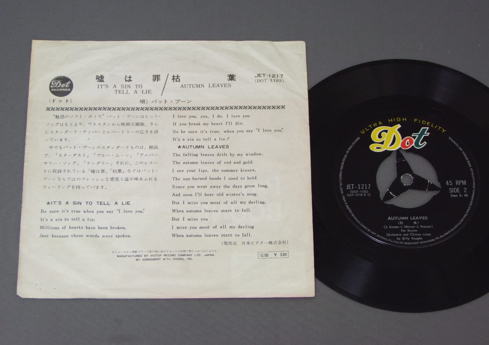 PAT BOONEパット・ブーン/IT`S A SIN TO TELL A LIE嘘は罪 JET1217 製造国:日本盤 / Media:7inch外観:EX-盤の状態:VG+ 価格(税込):¥550(売約済) 送料 7inch:定形外郵便 360円~LP:定形外郵便 660円~送料は、注文の最終画面で確認頂けます。 > > PAT BOONE/IT`S A SIN TO TELL A LIE 外観 (EX-)特記事項:右下にホッチキス穴。ヨレやや有り。外観EX-の共通説明:ダメージ軽度~多少。 中古品としては普通の状態。シミ、ヨゴレ、スレなど軽く~多少。 盤の状態 (VG+)特記事項:薄いスリキズ・細かいスレやや多め。プチ出そうな線キズも有りますが、全体的には軽微なものが中心です。少し聴いてみましたが、音自体はしっかり鳴っているようでした。盤VG+の共通説明:盤面にスリキズが多少~やや有り、音に出そうなものも多少ある。 Tweet それぞれの画像をクリックすると、大きい写真が見られます こちらの商品もお勧めです 2,420円 CLIFF RICHARDクリフ・リチャード / CLIFF IN JAPAN 1,210円 ELVIS PRESLEY / ON STAGE FEBRUARY 1970プレスリー・オン・ステージ 1970 990円 VENTURESベンチャーズ / ON STAGE ENCOREオン・ステージ・アンコール 770円 VARIOUS ARTISTS / YESTERDAY`S HITSイエスタデイズ・ヒッツ 1,320円 ELVIS PRESLEY / THAT`S THE WAY IT ISこの胸のときめきを 770円 WANDA JACKSONワンダ・ジャクスン / WANDA JACKSON COUNTRY !ワンダ・ジャクスン・カントリー 770円 ELVIS PRESLEYエルヴィス・プレスリー / ELVIS VOL2 A LEGENDARY PERFORMER + BOOKLETエルヴィス・プレスリーの歴史 VOL2 770円 ELVIS PRESLEYエルヴィス・プレスリー / THAT`S THE WAY IT IS映画 エルヴィス・オン・ステージ