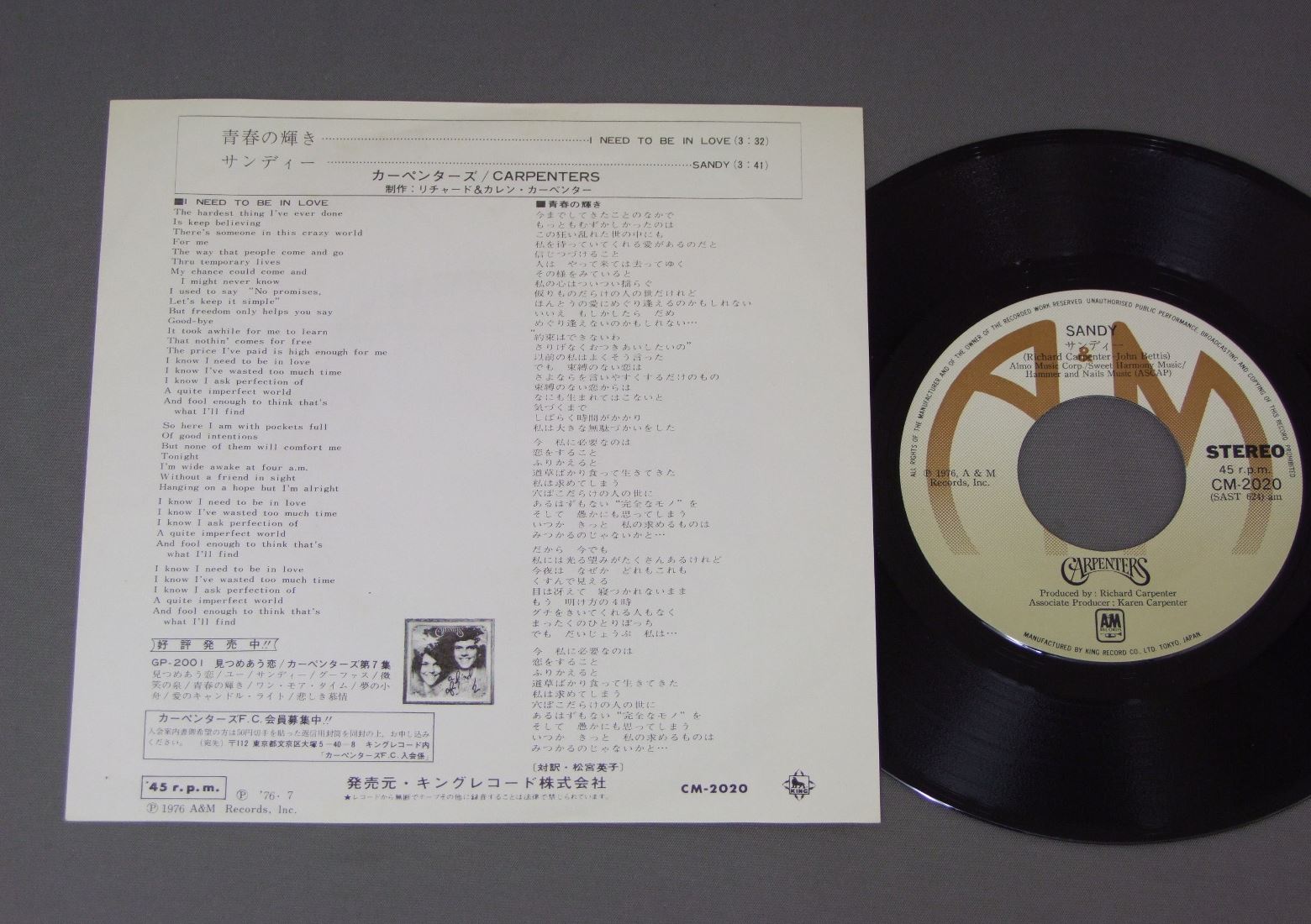 CARPENTERSカーペンターズ/I NEED TO BE IN LOVE青春の輝き CM2020 製造国:日本盤 / Media:7inch外観:EX盤の状態:EX 価格(税込):¥440(売約済) 送料 7inch:定形外郵便 360円~LP:定形外郵便 660円~送料は、注文の最終画面で確認頂けます。 > > CARPENTERS/I NEED TO BE IN LOVE 外観 (EX)特記事項:右下にホッチキス穴。外観EXの共通説明:ダメージが限定的。中古品としては保存状態がよい方。シミ、ヨゴレ、スレ 少し~軽度。 盤の状態 (EX)特記事項:薄いスリキズ・スレ少しある感じ。一見してきれいな印象です。盤EXの共通説明:盤面のスリキズが薄いものが少し~軽度 音に出そうなものは無いように見える(軽微なソフトティック音は除く)。 Tweet それぞれの画像をクリックすると、大きい写真が見られます こちらの商品もお勧めです 770円 OLIVIA NEWTON-JOHNオリビア・ニュートン・ジョン / PHYSICAL虹色の扉 770円 LINDA RONSTADTリンダ・ロンシュタット / LIVING IN THE U.S.A.ミス・アメリカ 660円 CRYSTAL GAYLEクリスタル・ゲイル / WE SHOULD BE TOGETHER夢のふれあい 770円 DANIELE LICARIダニエル・リカーリ / GOLDEN PRIZEゴールデン・プライズ 990円 CARLY SIMONカーリー・サイモン / TORCHトーチ 880円 ORIVIA NEWTON-JOHNオリビア・ニュートン・ジョン / DON`T STOP BELIEVIN`たそがれの恋 990円 DANIELLE LICARIダニエル・リカーリ / DANIELLE LICARIふたりの天使・シェルブールの雨傘 1,320円 VIKKI CARRヴィッキー・カー / SUPERSTARスーパースター